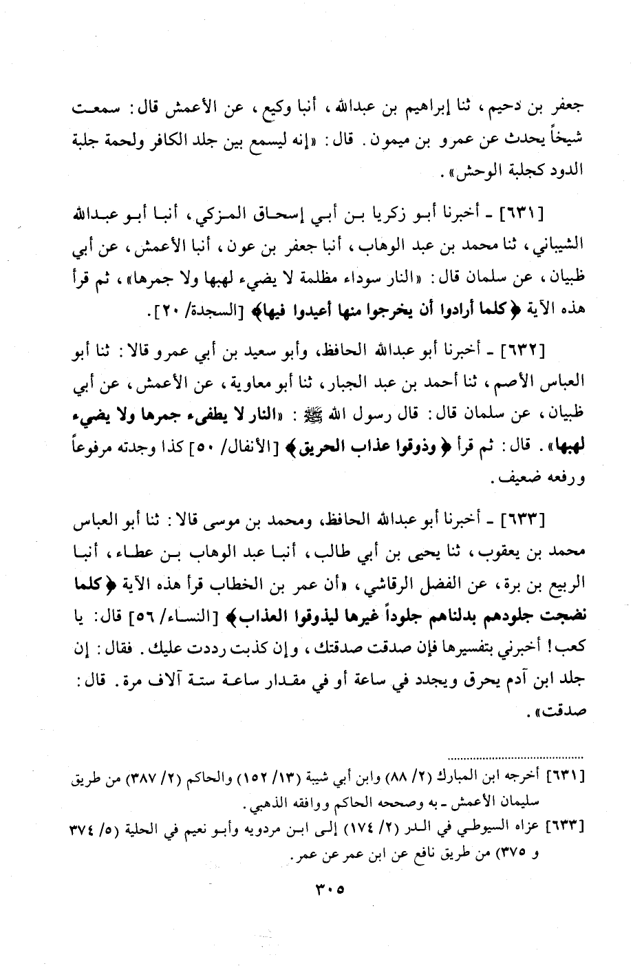 632 - (576) أَخْبَرَنَا أَبُو عَبْدِ اللَّهِ الْحَافِظُ، وَأَبُو سَعِيدِ بْنُ أَبِي عَمْرٍو، قَالَا: ثنا أَبُو الْعَبَّاسِ الْأَصَمُّ، ثنا أَحْمَدُ بْنُ عَبْدِ الْجَبَّارِ، ثنا أَبُو مُعَاوِيَةَ، عَنِ الْأَعْمَشِ، عَنْ أَبِي ظَبْيَانَ، عَنْ سَلْمَانَ، قَالَ: قَالَ رَسُولُ اللَّهِ صَلَّى اللهُ عَلَيْهِ وَسَلَّمَ: «النَّارُ لَا يُطْفَئُ جَمْرُهَا، وَلَا يُضِيءُ لَهَبُهَا» قَالَ: ثُمَّ قَرَأَ {وَذُوقُوا عَذَابَ الْحَرِيقِ}