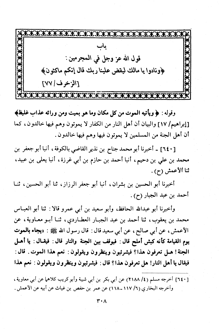 بَابُ قَوْلِ اللَّهِ عَزَّ وَجَلَّ فِي الْمُجْرِمِينَ: {وَنَادَوْا يَا مَالِكُ لِيَقْضِ عَلَيْنَا رَبُّكَ قَالَ إِنَّكُمْ مَاكِثُونَ} وَقَوْلِهِ: {وَيَاتِيهِ الْمَوْتُ مِنْ كُلِّ مَكَانٍ وَمَا هُوَ بِمَيِّتٍ وَمِنْ وَرَائِهِ عَذَابٌ غَلِيظٌ}، وَالْبَيَانِ أَنَّ أَهْلَ النَّارِ مِنَ الْكُفَّارِ لَا يَمُوتُونَ، وَهُمْ فِيهَا خَالِدُونَ، كما أَنَّ أَهْلَ الْجَنَّةِ مِنَ الْمُسْلِمِينَ لَا يَمُوتُونَ فِيهَا، وَهُمْ فِيهَا خَالِدُونَ