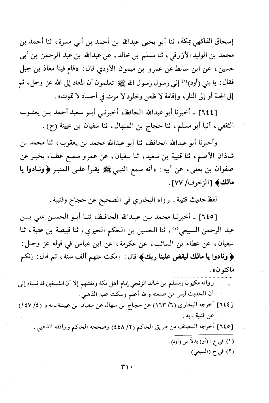 645 - (588) أَخْبَرَنَا مُحَمَّدُ بْنُ عَبْدِ اللَّهِ الْحَافِظُ، ثنا أَبُو الْحُسَيْنِ عَلِيُّ بْنُ عَبْدِ الرَّحْمَنِ السُّبْيعِيُّ، ثنا الْحُسَيْنُ بْنُ الْحَكَمِ الْحِيرِيُّ، ثنا قَبِيصَةُ بْنُ عُقْبَةَ، ثنا سُفْيَانُ، عَنْ عَطَاءِ بْنِ السَّائِبِ، عَنْ عِكْرِمَةَ، عَنِ ابْنِ عَبَّاسٍ، فِي قَوْلِهِ عَزَّ وَجَلَّ: {وَنَادَوْا يَا مَالِكُ لِيَقْضِ عَلَيْنَا رَبُّكَ}، قَالَ: " مَكَثَ عَنْهُمْ أَلْفَ سَنَةٍ ثُمَّ قَالَ: إِنَّكُمْ مَاكِثُونَ "
