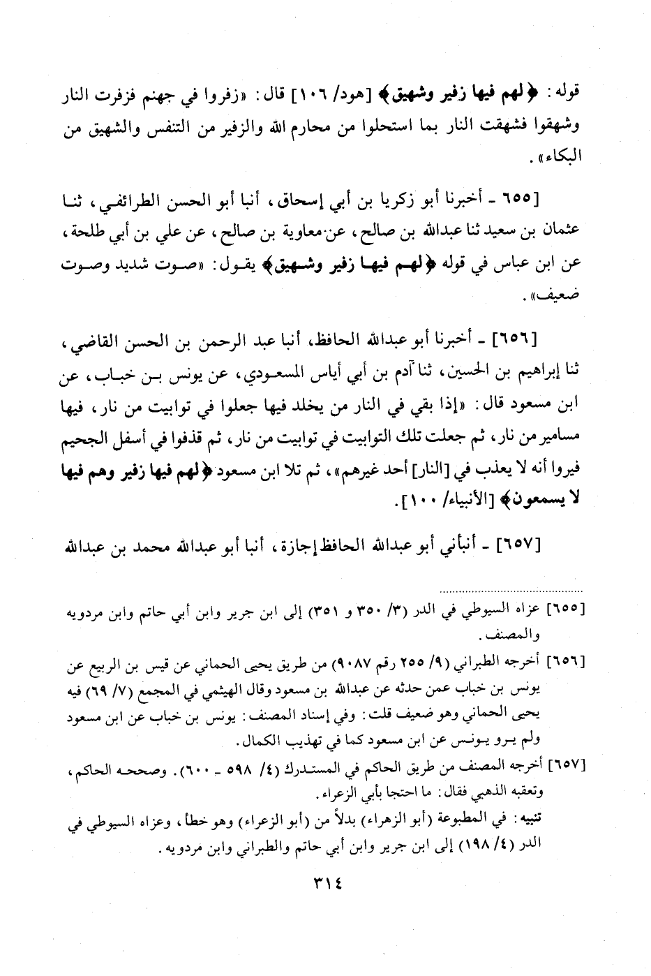 656 - (597) أَخْبَرَنَا أَبُو عَبْدِ اللَّهِ الْحَافِظُ، أَنْبَأَ عَبْدُ الرَّحْمَنِ بْنُ الْحَسَنِ الْقَاضِي، ثنا إِبْرَاهِيمُ بْنُ الْحُسَيْنِ، ثنا آدَمُ بْنُ أَبِي أيَاسَ عن الْمَسْعُودِيُّ، عَنْ يُونُسَ بْنِ خَبَّابٍ، عَنِ ابْنِ مَسْعُودٍ، قَالَ: " إِذَا بَقِيَ فِي النَّارِ مَنْ يُخَلَّدُ فِيهَا جُعِلُوا فِي تَوَابِيتَ مِنْ نَارٍ، فِيهَا مَسَامِيرُ مِنْ نَارٍ، ثُمَّ جُعِلَتْ تِلْكَ التَّوَابِيتُ فِي تَوَابِيتَ مِنْ نَارٍ، ثُمَّ جُعِلَتْ تِلْكَ التَّوَابِيتُ فِي تَوَابِيتَ مِنْ نَارٍ، ثُمَّ قُذِفُوا فِي أَسْفَلَ الْجَحِيمِ، فَيَرَوْا أَنَّهُ لَا يُعَذَّبُ فِي النَّارِ أَحَدٌ غَيْرَهُمْ، ثُمَّ تَلَا ابْنُ مَسْعُودٍ: {لَهُمْ فِيهَا زَفِيرٌ وَهُمْ فِيهَا لَا يَسْمَعُونَ}