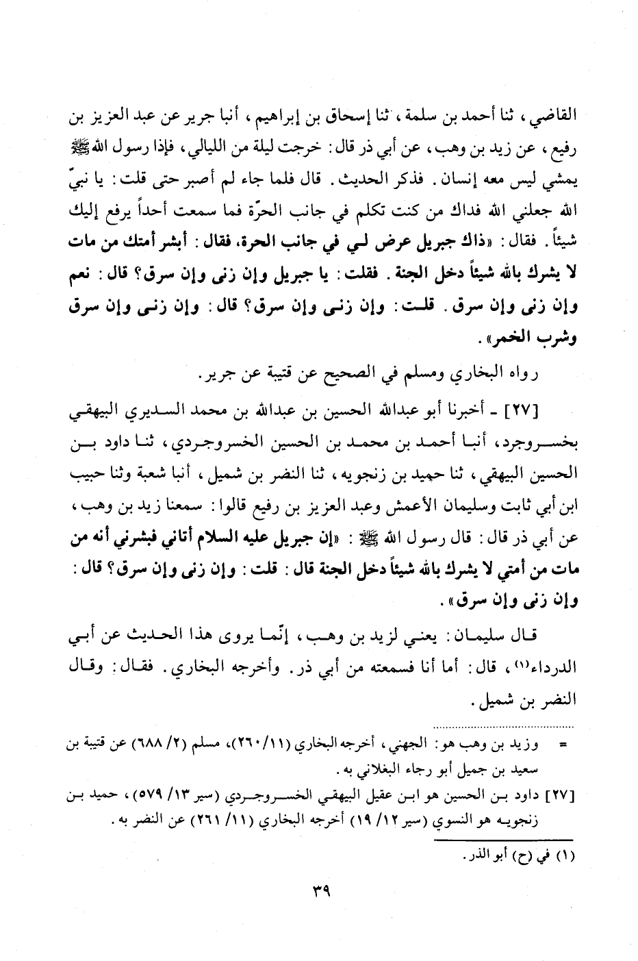 27 - (25) أَخْبَرَنَا أَبُو عَبْدِ اللَّهِ الْحُسَيْنُ بْنُ عَبْدِ اللَّهِ بْنِ مُحَمَّدٍ السَّدِيرِيُّ الْبَيْهَقِيُّ، بِخُسْرَوْجِرْدَ، أَنْبَأَ أَحْمَدُ بْنُ مُحَمَّدِ بْنِ الْحُسَيْنِ الْخُسْرَوْجِرْدِيُّ، ثنا دَاوُدُ بْنُ الْحُسَيْنِ الْبَيْهَقِيُّ، ثنا حُمَيْدُ بْنُ زَنْجُوَيْهِ، ثنا النَّضْرُ بْنُ شُمَيْلٍ، أَنْبَأَ شُعْبَةُ، وثنا حَبِيبُ بْنُ أَبِي ثَابِتٍ، وَسُلَيْمَانُ الْأَعْمَشُ، وَعَبْدُ الْعَزِيزِ بْنِ رُفَيْعٍ، قَالُوا: سَمِعْنَا زَيْدَ بْنَ وَهْبٍ، عَنْ أَبِي ذَرٍّ، قَالَ: قَالَ رَسُولُ اللَّهِ صَلَّى اللهُ عَلَيْهِ وَسَلَّمَ: «إِنَّ جِبْرِيلَ عَلَيْهِ السَّلَامُ أَتَانِي فَبَشَّرَنِي أَنَّهُ مَنْ مَاتَ مِنْ أُمَّتِي لَا يُشْرِكُ بِاللَّهِ شَيْئًا دَخَلَ الْجَنَّةَ»، قَالَ: قُلْتُ: وَإِنْ زَنَى وَإِنْ سَرَقَ؟، قَالَ: وَإِنْ زَنَى وَإِنْ سَرَقَ "