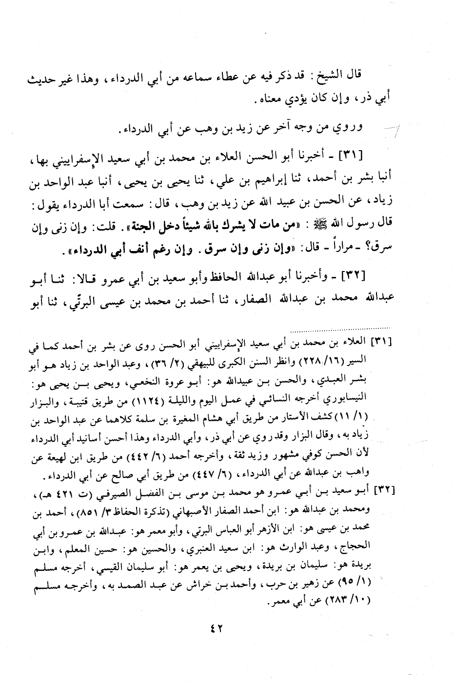 31 - (29) أَخْبَرَنَا أَبُو الْحَسَنِ الْعَلَاءُ بْنُ مُحَمَّدِ بْنِ أَبِي سَعِيدٍ الْإِسْفَرَايِينِيُّ، بِهَا، أَنْبَأَ بِشْرُ بْنُ أَحْمَدَ، ثنا إِبْرَاهِيمُ بْنُ عَلِيٍّ، ثنا يَحْيَى بْنُ يَحْيَى، أَنْبَأَ عَبْدُ الْوَاحِدِ بْنُ زِيَادٍ، عَنِ الْحَسَنِ بْنِ عُبَيْدِ اللَّهِ، عَنْ زَيْدِ بْنِ وَهْبٍ، قَالَ: سَمِعْتُ أَبَا الدَّرْدَاءِ، يَقُولُ: قَالَ رَسُولُ اللَّهِ صَلَّى اللهُ عَلَيْهِ وَسَلَّمَ: «مَنْ مَاتَ لَا يُشْرِكُ بِاللَّهِ شَيْئًا دَخَلَ الْجَنَّةَ»، قُلْتُ: وَإِنْ زَنَى وَإِنْ سَرَقَ؟ - مِرَارًا - قَالَ: وَإِنْ زَنَى وَإِنْ سَرَقَ، وَإِنْ رَغِمَ أَنْفُ أَبِي الدَّرْدَاءِ "