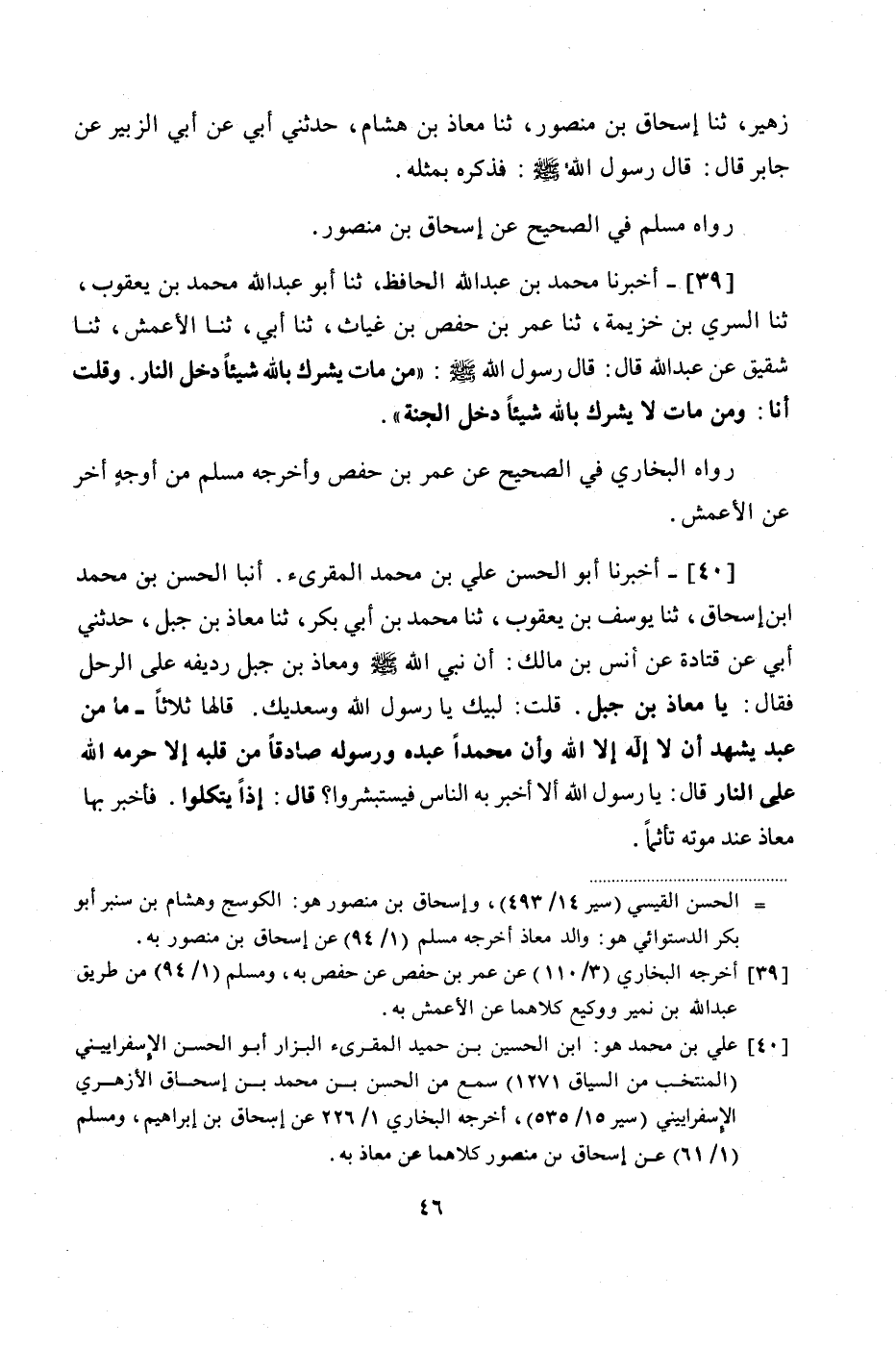 39 - (37) أَخْبَرَنَا مُحَمَّدُ بْنُ عَبْدِ اللَّهِ الْحَافِظُ، ثنا أَبُو عَبْدِ اللَّهِ مُحَمَّدُ بْنُ يَعْقُوبَ، ثنا السَّرِيُّ بْنُ خُزَيْمَةَ، ثنا عُمَرُ بْنُ حَفْصِ بْنِ غِيَاثٍ، ثنا أَبِي، ثنا الْأَعْمَشُ، ثنا شَقِيقٌ، عَنْ عَبْدِ اللَّهِ، قَالَ: قَالَ رَسُولُ اللَّهِ صَلَّى اللهُ عَلَيْهِ وَسَلَّمَ: «مَنْ مَاتَ يُشْرِكُ بِاللَّهِ شَيْئًا دَخَلَ النَّارَ» وَقُلْتُ: أَنَا: وَمَنْ مَاتَ لَا يُشْرِكُ بِاللَّهِ شَيْئًا دَخَلَ الْجَنَّةَ "