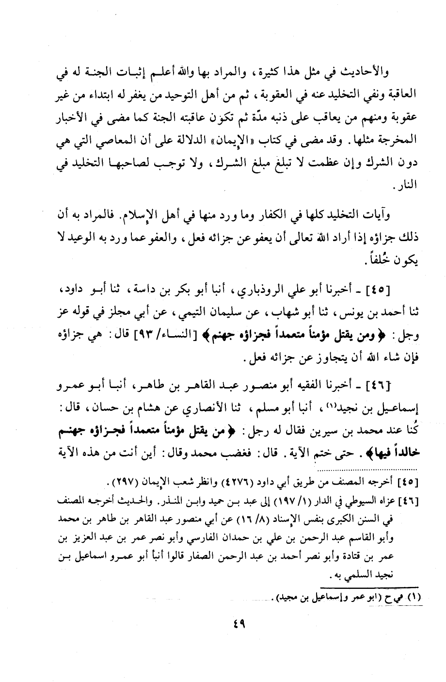 45 - (42) أَخْبَرَنَا أَبُو عَلِيٍّ الرُّوذَبَارِيُّ، أَنْبَأَ أَبُو بَكْرِ بْنُ دَاسَةَ، ثنا أَبُو دَاوُدَ، ثنا أَحْمَدُ بْنُ يُونُسَ، ثنا أَبُو شِهَابٍ، عَنْ سُلَيْمَانَ التَّيْمِيِّ، عَنْ أَبِي مِجْلَزٍ، فِي قَوْلِهِ عَزَّ وَجَلَّ: {وَمَنْ يَقْتُلْ مُؤْمِنًا مُتَعَمِّدًا فَجَزَاؤُهُ جَهَنَّمُ} قَالَ: «هِيَ جَزَاؤُهُ فَإِنْ شَاءَ اللَّهُ أَنْ يَتَجَاوَزَ عَنْ جَزَائِهِ فَعَلَ»