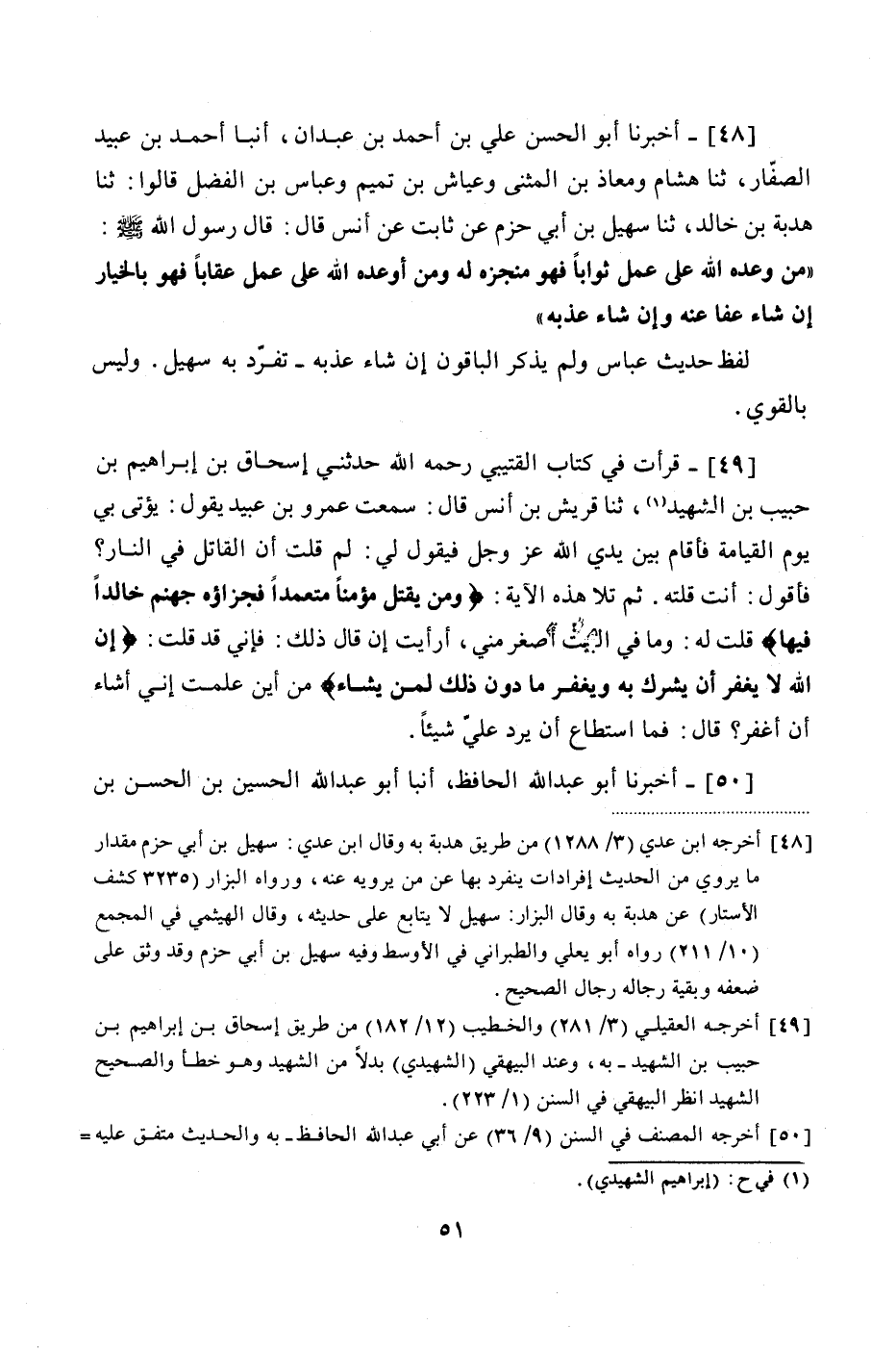 48 - (45) أَخْبَرَنَا أَبُو الْحَسَنِ عَلِيُّ بْنُ أَحْمَدَ بْنِ عَبْدَانَ، أَنْبَأَ أَحْمَدُ بْنُ عُبَيْدٍ الصَّفَّارُ، ثنا هِشَامٌ، وَمُعَاذُ بْنُ الْمُثَنَّى، وَعَيَّاشُ بْنُ تَمِيمٍ، وَعَبَّاسُ بْنُ الْفَضْلِ، قَالُوا: ثنا هُدْبَةُ بْنُ خَالِدٍ، ثنا سُهَيْلُ بْنُ أَبِي حَزْمٍ، عَنْ ثَابِتٍ، عَنْ أَنَسٍ، قَالَ: قَالَ رَسُولُ اللَّهِ صَلَّى اللهُ عَلَيْهِ وَسَلَّمَ: «مَنْ وَعْدَهُ اللَّهُ عَلَى عَمَلٍ ثَوَابًا فَهُوَ مُنْجِزُهُ لَهُ وَمَنْ أَوْعَدَهُ اللَّهُ عَلَى عَمَلٍ عِقَابًا فَهُوَ بِالْخِيَارِ إِنْ شَاءَ عَفَا عَنْهُ وَإِنْ شَاءَ عَذَّبَهُ» لَفْظُ حَدِيثِ عَبَّاسٍ وَلَمْ يَذْكُرِ الْبَاقُونَ إِنْ شَاءَ عَذَّبَهُ - تَفَرَّدَ بِهِ سُهَيْلٌ، وَلَيْسَ بِالْقَوِيِّ
