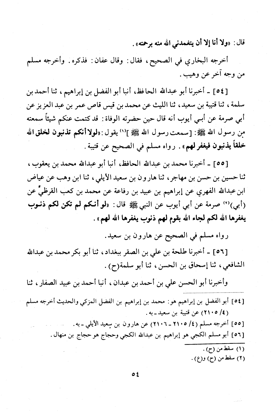 54 - (50) أَخْبَرَنَا أَبُو عَبْدِ اللَّهِ الْحَافِظُ، أَنْبَأَ أَبُو الْفَضْلِ بْنُ إِبْرَاهِيمَ، ثنا أَحْمَدُ بْنُ سَلَمَةَ، ثنا قُتَيْبَةُ بْنُ سَعِيدٍ، ثنا اللَّيْثُ، عَنْ مُحَمَّدِ بْنِ قَيْسٍ، قَاصِّ عُمَرَ بْنِ عَبْدِ الْعَزِيزِ، عَنْ أَبِي صِرْمَةَ، عَنْ أَبِي أَيُّوبَ، أَنَّهُ قَالَ حِينَ حَضَرَتْهُ الْوَفَاةُ: قَدْ كَتَمْتُ عَنْكُمْ شَيْئًا سَمِعْتُ مِنْ رَسُولِ اللَّهِ صَلَّى اللهُ عَلَيْهِ وَسَلَّمَ يَقُولُ: «لَوْلَا أَنَّكُمْ تُذْنِبُونَ لِخَلَقَ اللَّهُ خَلْقًا يُذْنِبُونَ فَيَغْفِرُ لَهُمْ»
