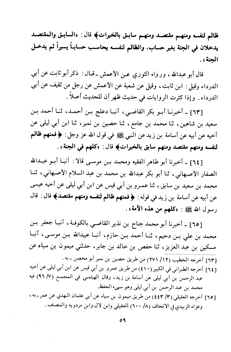 63 - (59) أَخْبَرَنَا أَبُو بَكْرٍ الْقَاضِي، أَنْبَأَ دِعْلِجُ بْنُ أَحْمَدَ، ثنا أَحْمَدُ بْنُ سَعِيدِ بْنِ شَاهِينَ، ثنا مُحَمَّدُ بْنُ جَامِعٍ، ثنا حُصَيْنُ بْنُ نُمَيْرٍ، ثنا ابْنُ أَبِي لَيْلَى، عَنْ أَخِيهِ، عَنْ أَبِيهِ، عَنْ أُسَامَةَ بْنِ زَيْدٍ، عَنِ النَّبِيِّ صَلَّى اللهُ عَلَيْهِ وَسَلَّمَ فِي قَوْلِ اللَّهِ عَزَّ وَجَلَّ: {فَمِنْهُمْ ظَالِمٌ لِنَفْسِهِ وَمِنْهُمْ مُقْتَصِدٌ وَمِنْهُمْ سَابِقٌ بِالْخَيْرَاتِ} قَالَ: «كُلُّهُمْ فِي الْجَنَّةِ»
