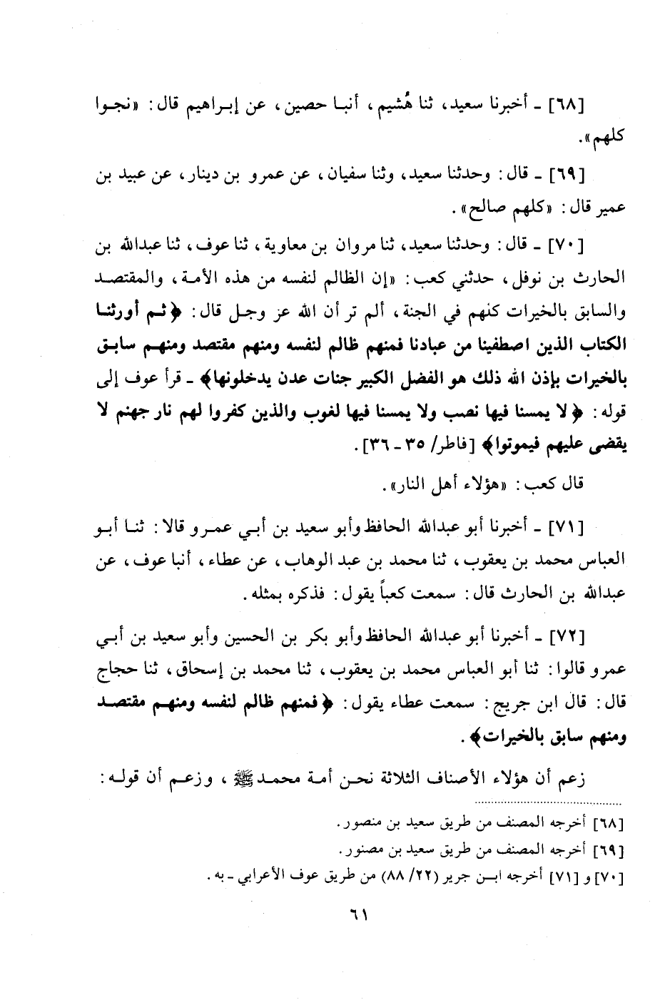 70 - (64) قَالَ وَحَدَّثنا سَعِيدٌ، ثنا مَرْوَانُ بْنُ مُعَاوِيَةَ، ثنا عَوْفٌ، ثنا عَبْدُ اللَّهِ بْنُ الْحَارِثِ بْنِ نَوْفَلٍ، حَدَّثَنِي كَعْبٌ: " إِنَّ الظَّالِمَ لِنَفْسِهِ مِنْ هَذِهِ الْأُمَّةِ، وَالْمُقْتَصِدُ وَالسَّابِقُ بِالْخَيْرَاتِ كُلُّهُمْ فِي الْجَنَّةِ، أَلَمْ تَرَ أَنَّ اللَّهَ عَزَّ وَجَلَّ قَالَ: {ثُمَّ أَوْرَثْنَا الْكِتَابَ الَّذِينَ اصْطَفَيْنَا مِنْ عِبَادِنَا فَمِنْهُمْ ظَالِمٌ لِنَفْسِهِ وَمِنْهُمْ مُقْتَصِدٌ، وَمِنْهُمْ سَابِقٌ بِالْخَيْرَاتِ بِإِذْنِ اللَّهِ ذَلِكَ هُوَ الْفَضْلُ الْكَبِيرُ جَنَّاتُ عَدْنٍ يَدْخُلُونَهَا} قَرَأَ عَوْفٌ إِلَى قَوْلِهِ {لَا يَمَسُّنَا فِيهَا نَصَبٌ وَلَا يَمَسُّنَا فِيهَا لُغُوبٌ، وَالَّذِينَ كَفَرُوا لَهُمْ نَارُ جَهَنَّمَ لَا يُقْضَى عَلَيْهِمْ فَيَمُوتُوا} قَالَ كَعْبٌ: «هَؤُلَاءِ أَهْلُ النَّارِ»