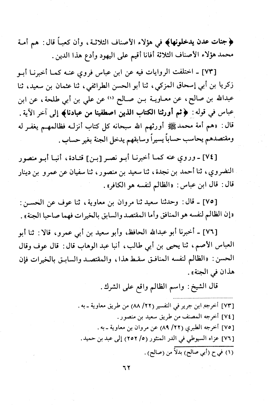 73 - اخْتَلَفَتِ الرِّوَايَاتُ فِيهِ عَنِ ابْنِ عَبَّاسٍ فَرُوِيَ عَنْهُ كَمَا (67) أَخْبَرَنَا أَبُو زَكَرِيَّا بْنُ أَبِي إِسْحَاقَ الْمُزَكِّي، ثنا أَبُو الْحَسَنِ الطَّرَائِفِيُّ، ثنا عُثْمَانُ بْنُ سَعِيدٍ، ثنا عَبْدُ اللَّهِ بْنُ صَالِحٍ، عَنْ مُعَاوِيَةَ بْنِ صَالِحٍ، عَنْ عَلِيِّ بْنِ أَبِي طَلْحَةَ، عَنِ ابْنِ عَبَّاسٍ، فِي قَوْلِهِ {ثُمَّ أَوْرَثْنَا الْكِتَابَ الَّذِينَ اصْطَفَيْنَا مِنْ عِبَادِنَا "} إِلَى آخِرِ الْآيَةِ قَالَ: «هُمْ أُمَّةُ مُحَمَّدٍ صَلَّى اللهُ عَلَيْهِ وَسَلَّمَ أَوْرَثَهُمُ اللَّهُ سُبْحَانَهُ كُلَّ كِتَابٍ أَنْزَلَهُ فَظَالِمُهُمْ يُغْفَرُ لَهُ وَمُقْتَصِدُهُمْ يُحَاسَبُ حِسَابًا يَسِيرًا وَسَابِقُهُمْ يَدْخُلُ الْجَنَّةَ بِغَيْرِ حِسَابٍ»