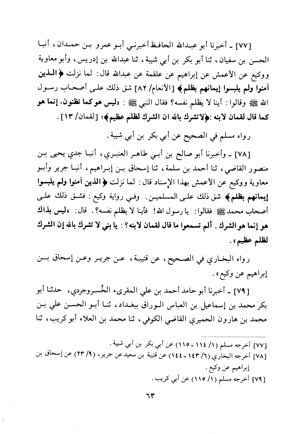77 - (71) أَخْبَرَنَا أَبُو عَبْدِ اللَّهِ الْحَافِظُ، أَخْبَرَنِي أَبُو عَمْرِو بْنُ حَمْدَانَ، أَنْبَأَ الْحَسَنُ بْنُ سُفْيَانَ، ثنا أَبُو بَكْرِ بْنُ أَبِي شَيْبَةَ، ثنا عَبْدُ اللَّهِ بْنُ إِدْرِيسَ، وَأَبُو مُعَاوِيَةَ، وَوَكِيعٌ، عَنِ الْأَعْمَشِ، عَنْ إِبْرَاهِيمَ، عَنْ عَلْقَمَةَ، عَنْ عَبْدِ اللَّهِ، قَالَ: لَمَّا نَزَلَتْ {الَّذِينَ آمَنُوا وَلَمْ يَلْبِسُوا إِيمَانَهُمْ بِظُلْمٍ} شَقَّ ذَلِكَ عَلَى أَصْحَابِ رَسُولِ اللَّهِ صَلَّى اللهُ عَلَيْهِ وَسَلَّمَ وَقَالُوا: أَيُّنَا لَا يَظْلِمُ نَفْسَهُ؟ فَقَالَ النَّبِيُّ صَلَّى اللهُ عَلَيْهِ وَسَلَّمَ: " لَيْسَ هُوَ كَمَا تَظُنُّونَ، إِنَّمَا هُوَ كَمَا قَالَ لُقْمَانُ لِابْنِهِ: {لَا تُشْرِكْ بِاللَّهِ إِنَّ الشِّرْكَ لَظُلْمٌ عَظِيمٌ}