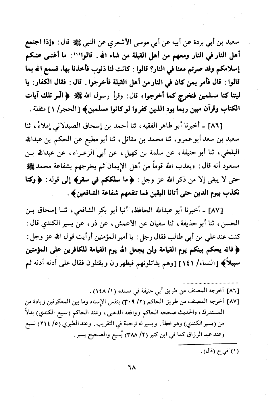 86 - (80) أَخْبَرَنَا أَبُو طَاهِرٍ الْفَقِيهُ، ثنا أَحْمَدُ بْنُ إِسْحَاقَ الصَّيْدَلَانِيُّ، إِمْلَاءً، ثنا سَعِيدُ بْنُ سَعْدٍ أَبُو عَمْرٍو، ثنا مُحَمَّدُ بْنُ مُقَاتِلٍ، ثنا أَبُو مُطِيعٍ الْحَكَمِ بْنِ عَبْدِ اللَّهِ الْبَلْخِيِّ، ثنا أَبُو حَنِيفَةَ، عَنْ سَلَمَةَ بْنِ كُهَيْلٍ، عَنْ أَبِي الزَّعْرَاءِ، عَنْ عَبْدِ اللَّهِ بْنِ مَسْعُودٍ، أَنَّهُ قَالَ: يُعَذَّبُ اللَّهُ قَوْمًا مِنْ أَهْلِ الْإِيمَانِ ثُمَّ يُخْرِجُهُمْ بِشَفَاعَةِ مُحَمَّدٍ صَلَّى اللهُ عَلَيْهِ وَسَلَّمَ حَتَّى لَا يَبْقَى إِلَّا مَنْ ذَكَرَ اللَّهُ عَزَّ وَجَلَّ {مَا سَلَكَكُمْ فِي سَقَرَ} إِلَى قَوْلِهِ {وَكُنَّا نُكَذِّبُ بِيَوْمِ الدِّينِ، حَتَّى أَتَانَا الْيَقِينُ، فَمَا تَنْفَعُهُمْ شَفَاعَةُ الشَّافِعِينَ}