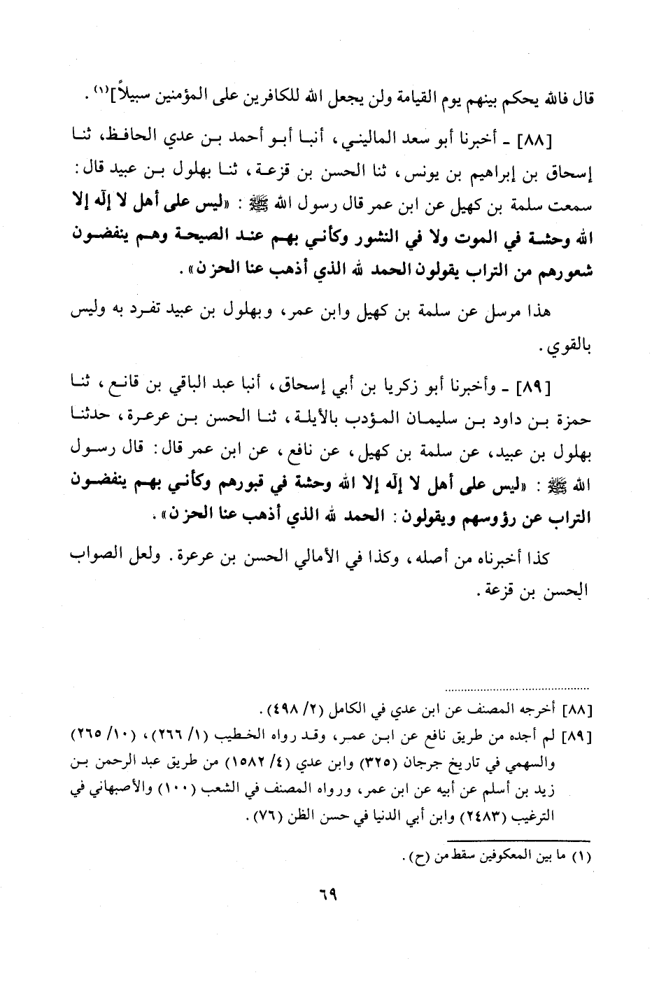 89 - (83) وَأَخْبَرَنَا أَبُو زَكَرِيَّا بْنُ أَبِي إِسْحَاقَ، أَنْبَأَ عَبْدُ الْبَاقِي بْنُ قَانِعٍ، ثنا حَمْزَةُ بْنُ دَاوُدَ بْنِ سُلَيْمَانَ الْمُؤَدِّبُ، بِالْأَيْلَةِ، ثنا الْحَسَنُ بْنُ عَرْعَرَةَ، حَدَّثَنَا بُهْلُولُ بْنُ عُبَيْدٍ، عَنْ سَلَمَةَ بْنِ كُهَيْلٍ، عَنْ نَافِعٍ، عَنِ ابْنِ عُمَرَ، قَالَ: قَالَ رَسُولُ اللَّهِ صَلَّى اللهُ عَلَيْهِ وَسَلَّمَ: " لَيْسَ عَلَى أَهْلِ لَا إِلَهَ إِلَّا اللَّهُ وَحْشَةٌ فِي قُبُورِهُمْ، وَكَأَنِّي بِهِمْ يَنْفُضُونَ التُّرَابَ عَنْ رُءُوسِهِمْ وَيَقُولُونَ: الْحَمْدُ لِلَّهِ الَّذِي أَذْهَبَ عَنَّا الْحَزَنَ "
