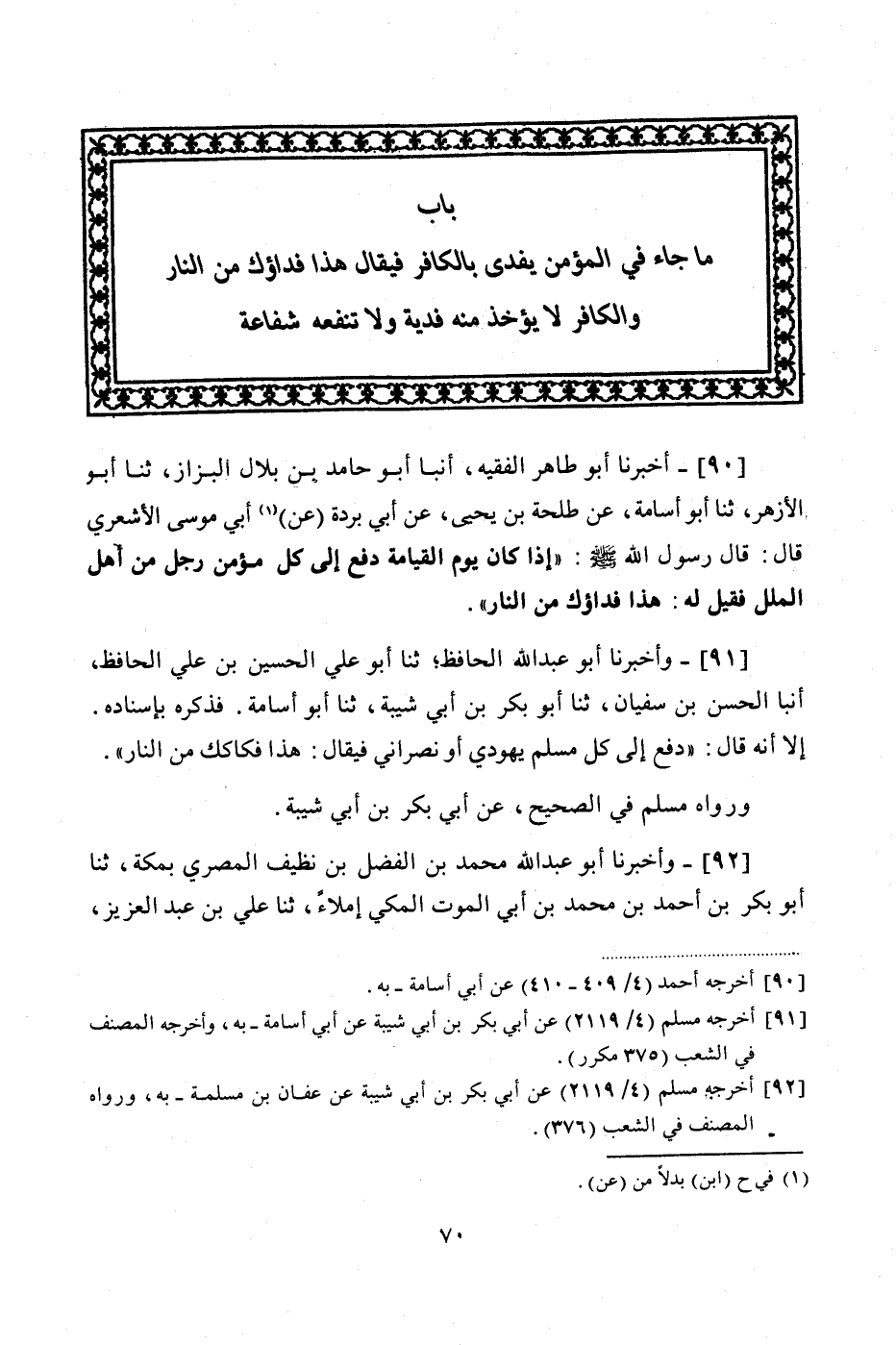 91 - (85) وَأَخْبَرَنَا أَبُو عَبْدِ اللَّهِ الْحَافِظُ، ثنا أَبُو عَلِيّ الْحُسَيْنِ بْنُ عَلِيٍّ الْحَافِظُ، أَنْبَأَ الْحَسَنُ بْنُ سُفْيَانَ، ثنا أَبُو بَكْرِ بْنُ أَبِي شَيْبَةَ، ثنا أَبُو أُسَامَةَ، فَذَكَرَهُ بِإِسْنَادِهِ إِلَّا أَنَّهُ قَالَ: " دُفِعَ إِلَى كُلِّ مُسْلِمٍ يَهُودِيُّ، أَوْ نَصْرَانِيُّ فَيُقَالُ: هَذَا فِكَاكُكَ مِنَ النَّارِ "