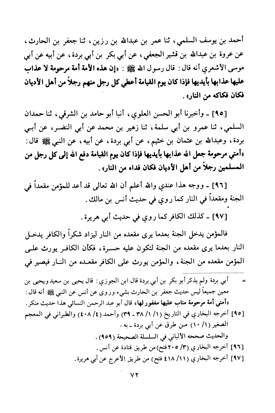 95 - (89) وَأَخْبَرَنَا أَبُو الْحَسَنِ الْعَلَوِيُّ، أَنْبَأَ أَبُو حَامِدِ بْنُ الشَّرْقِيُّ، ثنا حَمْدَانَ السُّلَمِيُّ، ثنا عَمْرُو بْنُ أَبِي سَلَمَةَ، ثنا زُهَيْرُ بْنُ مُحَمَّدٍ، عَنْ أَبِي النَّضْرِ، عَنْ أَبِي بُرْدَةَ، وَعَبْدِ اللَّهِ بْنِ عُثْمَانَ بْنِ خُثَيْمٍ، عَنْ أَبِي بُرْدَةَ، عَنْ أَبِيهِ، عَنِ النَّبِيِّ صَلَّى اللهُ عَلَيْهِ وَسَلَّمَ قَالَ: «أُمَّتِي مَرْحُومَةٌ جَعَلَ اللَّهُ عَذَابَهَا بِأَيْدِيهَا فَإِذَا كَانَ يَوْمُ الْقِيَامَةِ دَفَعَ اللَّهُ إِلَى كُلِّ رَجُلٍ مِنَ الْمُسْلِمِينَ رَجُلًا مِنْ أَهْلِ الْأَدْيَانِ، فَكَانَ فِدَاهُ مِنَ النَّارِ»