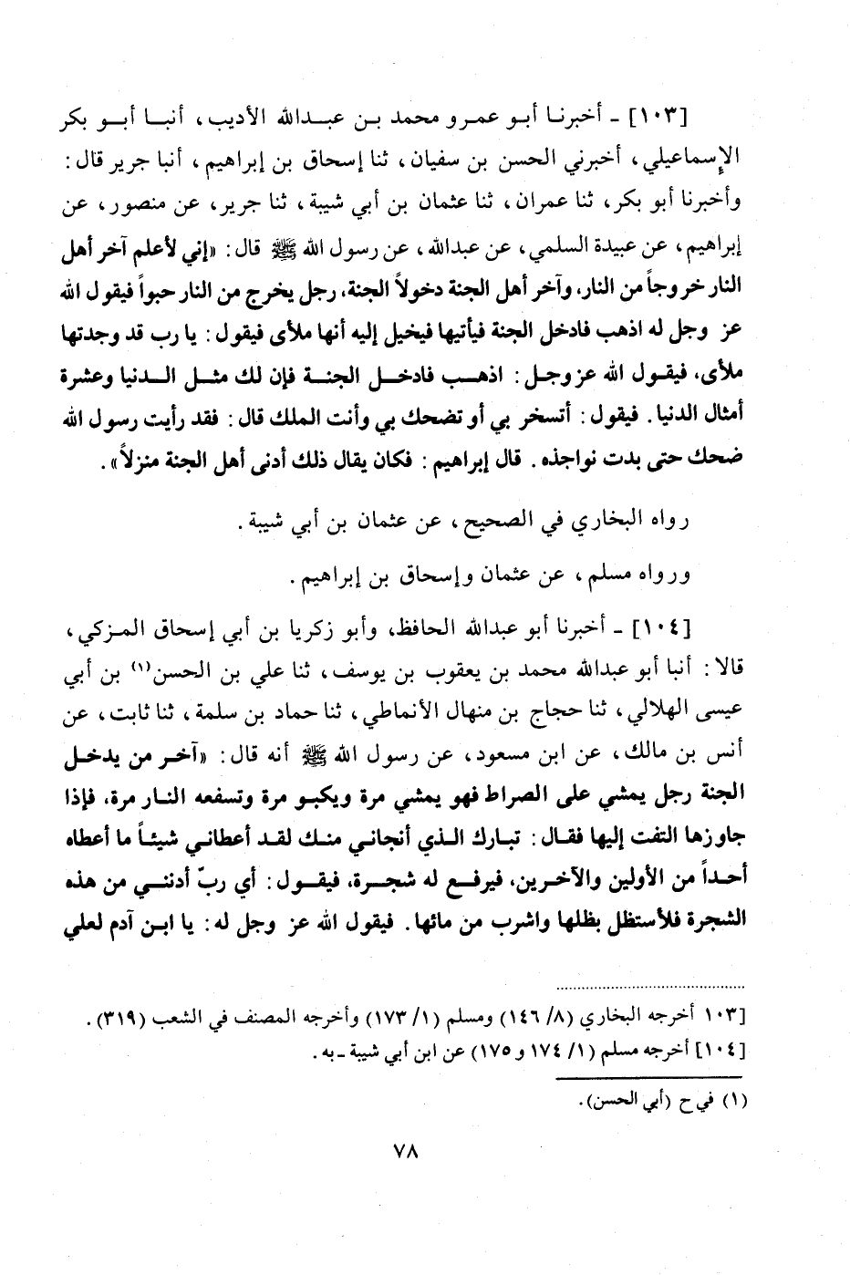 103 - (95) أَخْبَرَنَا أَبُو عَمْرٍو مُحَمَّدُ بْنُ عَبْدِ اللَّهِ الْأَدِيبُ، أَنْبَأَ أَبُو بَكْرٍ الْإِسْمَاعِيلِيُّ، أَخْبَرَنِي الْحَسَنُ بْنُ سُفْيَانَ، ثنا إِسْحَاقُ بْنُ إِبْرَاهِيمَ، أَنْبَأَ جَرِيرٌ، قَالَ: وَأَخْبَرَنَا أَبُو بَكْرٍ، ثنا عِمْرَانُ، ثنا عُثْمَانُ بْنُ أَبِي شَيْبَةَ، ثنا جَرِيرٌ، عَنْ مَنْصُورٍ، عَنْ إِبْرَاهِيمَ، عَنْ عَبِيْدَةَ السلمي، عَنْ عَبْدِ اللَّهِ، عَنْ رَسُولِ اللَّهِ صَلَّى اللهُ عَلَيْهِ وَسَلَّمَ قَالَ: " إِنِّي لَأَعْلَمُ آخِرَ أَهْلِ النَّارِ خُرُوجًا مِنَ النَّارِ وَآخَرَ أَهْلِ الْجَنَّةِ دُخُولًا الْجَنَّةَ، رَجُلٌ يَخْرُجُ مِنَ النَّارِ حَبْوًا، فَيَقُولُ اللَّهُ عَزَّ وَجَلَّ لَهُ: اذْهَبْ فَادْخُلِ الْجَنَّةَ فَيَاتِيَهَا فَيُخَيَّلُ إِلَيْهِ أَنَّهَا مَلْأَى، فَيَقُولُ: يَا رَبِّ قَدْ وَجَدْتُهَا مَلْأَى، فَيَقُولُ لَهُ عَزَّ وَجَلَّ: اذْهَبْ فَادْخُلِ الْجَنَّةَ فَإِنَّ لَكَ مِثْلَ الدُّنْيَا، وَعَشَرَةَ أَمْثَالِ الدُّنْيَا. فَيَقُولُ: أَتَسْخَرُ بِي أَوْ تَضْحَكُ بِي، وَأَنْتَ الْمَلِكُ؟ قَالَ: فَقَدْ رَأَيْتُ رَسُولَ اللَّهِ ضَحِكَ حَتَّى بَدَتْ نَوَاجِذُهُ " قَالَ إِبْرَاهِيمُ: فَكَانَ يُقَالُ ذَلِكَ أَدْنَى أَهْلِ الْجَنَّةِ مَنْزِلًا ".