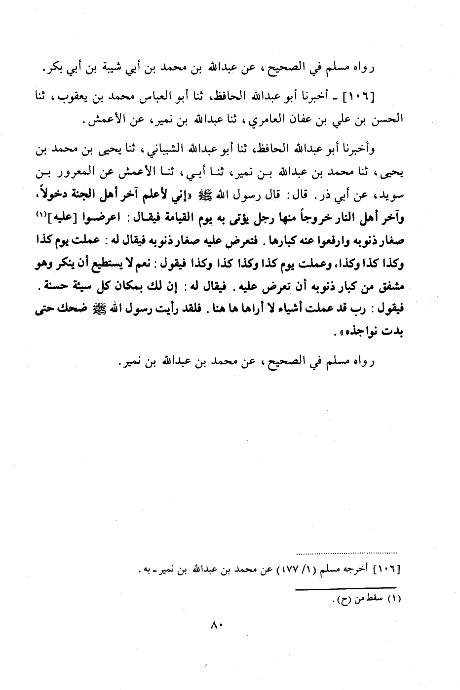 106 - (98) أَخْبَرَنَا أَبُو عَبْدِ اللَّهِ الْحَافِظُ، ثنا أَبُو الْعَبَّاسِ مُحَمَّدُ بْنُ يَعْقُوبَ، ثنا الْحَسَنُ بْنُ عَلِيِّ بْنِ عَفَّانَ الْعَامِرِيُّ، ثنا عَبْدُ اللَّهِ بْنُ نُمَيْرٍ، عَنِ الْأَعْمَشِ، وَأَخْبَرَنَا أَبُو عَبْدِ اللَّهِ الْحَافِظُ، ثنا أَبُو عَبْدِ اللَّهِ الشَّيْبَانِيُّ، ثنا يَحْيَى بْنُ مُحَمَّدِ بْنِ يَحْيَى، ثنا مُحَمَّدُ بْنُ عَبْدِ اللَّهِ بْنِ نُمَيْرٍ، ثنا أَبِي، ثنا الْأَعْمَشُ، عَنِ الْمَعْرُورِ بْنِ سُوَيْدٍ، عَنْ أَبِي ذَرٍّ، قَالَ: قَالَ رَسُولُ اللَّهِ صَلَّى اللهُ عَلَيْهِ وَسَلَّمَ: " إِنِّي لَأَعْلَمُ آخِرَ أَهْلِ الْجَنَّةِ دُخُولًا وَآخِرَ أَهْلِ النَّارِ خُرُوجًا مِنْهَا رَجُلٌ يُؤْتَى بِهِ يَوْمَ الْقِيَامَةِ فَيُقَالُ: اعْرِضُوا عليه صِغَارَ ذُنُوبِهِ وَارْفَعُوا عَنْهُ كِبَارَهَا. فَتعْرَضُ عَلَيْهِ صِغَارُ ذُنُوبِهِ، فَيُقَالُ لَهُ: عَمِلْتَ يَوْمَ كَذَا وَكَذَا كَذَا وَكَذَا، وَعَمِلْتَ يَوْمَ كَذَا وَكَذَا كَذَا وَكَذَا فَيَقُولُ: نَعَمْ لَا يَسْتَطِيعُ أَنْ يُنْكِرَ وَهُوَ مُشْفِقٌ مِنْ كِبَارِ ذُنُوبِهِ أَنْ تُعْرَضَ عَلَيْهِ. فَيُقَالُ لَهُ: إِنَّ لَكَ بِمَكَانِ كُلِّ سَيِّئَةٍ حَسَنَةً. فَيَقُولُ: رَبِّ قَدْ عَمِلْتُ أَشْيَاءَ لَا أَرَاهَا هَاهُنَا. فَلَقَدْ رَأَيْتُ رَسُولَ اللَّهِ صَلَّى اللهُ عَلَيْهِ وَسَلَّمَ ضَحِكَ حَتَّى بَدَتْ نَوَاجِذُهُ "