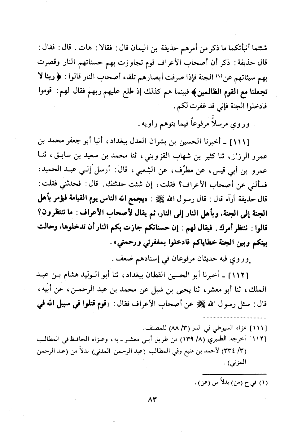 111 - (103) أَخْبَرَنَا الْحُسَيْنُ بْنُ بُشْرَانَ الْعَدْلُ، بِبَغْدَادَ، أَنْبَأَ أَبُو جَعْفَرٍ مُحَمَّدُ بْنُ عَمْرٍو الرَّزَّازُ، ثنا كَثِيرُ بْنُ شِهَابٍ الْقَزْوِينِيُّ، ثنا مُحَمَّدُ بْنُ سَعِيدِ بْنِ سَابِقٍ، ثنا عَمْرُو بْنُ أَبِي قَيْسٍ، عَنْ مُطَرِّفٍ، عَنِ الشَّعْبِيِّ، قَالَ: أَرْسَلَ إِلَيَّ عَبْدُ الْحَمِيدِ، فَسَأَلَنِي عَنْ أَصْحَابِ الْأَعْرَافِ؟ فَقُلْتُ: إِنْ شِئْتَ حَدَّثْتُكَ. قَالَ: فَحَدِّثْنِي. فَقُلْتُ: قَالَ حُذَيْفَةُ أَرَاهُ قَالَ: قَالَ رَسُولُ اللَّهِ صَلَّى اللهُ عَلَيْهِ وَسَلَّمَ: " يَجْمَعُ اللَّهُ النَّاسَ يَوْمَ الْقِيَامَةِ، فَيُؤْمَرُ بِأَهْلِ الْجَنَّةِ إِلَى الْجَنَّةِ، وَبِأَهْلِ النَّارِ إِلَى النَّارِ، ثُمَّ يُقَالُ لِأَصْحَابِ الْأَعْرَافِ: مَا تَنْتَظِرُونَ؟ قَالُوا: نَنْتَظِرُ أَمْرَكَ. فَيُقَالُ لَهُمْ: إِنَّ حَسَنَاتِكُمْ جَازَتْ بِكُمُ النَّارَ، أَنْ تَدْخُلُوهَا، وَحَالَتْ بَيْنَكُمْ وَبَيْنَ الْجَنَّةِ خَطَايَاكُمْ، فَادْخُلُوا بِمَغْفِرَتِي وَرَحْمَتِي "