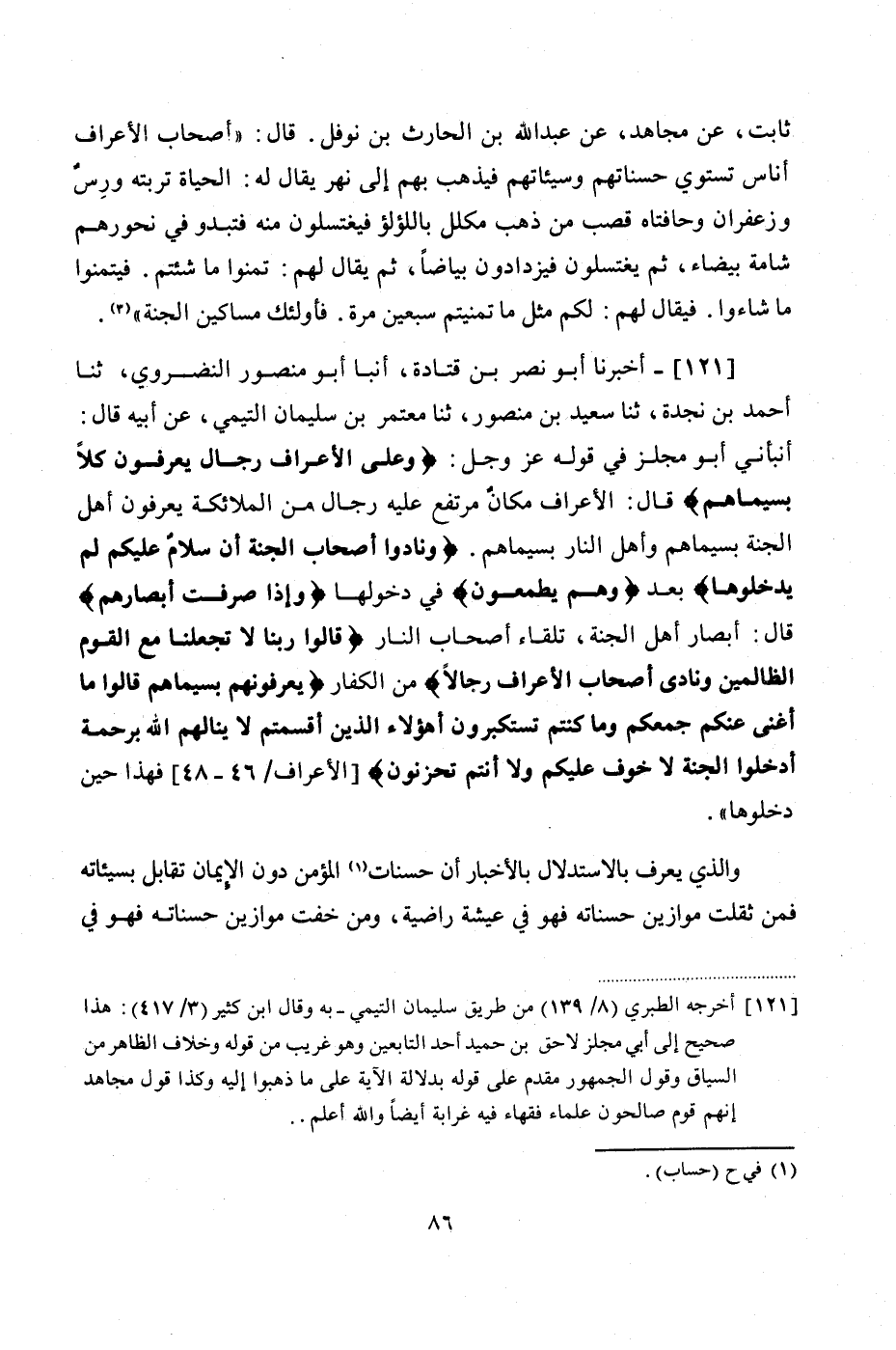 121 - (112) أَخْبَرَنَا أَبُو نَصْرِ بْنُ قَتَادَةَ، أَنْبَأَ أَبُو مَنْصُورٍ النَّضْرَوِيُّ، ثنا أَحْمَدُ بْنُ نَجْدَةَ، ثنا سَعِيدُ بْنُ مَنْصُورٍ، ثنا مُعْتَمِرُ بْنُ سُلَيْمَانَ التَّيْمِيُّ، عَنْ أَبِيهِ، قَالَ: أَنْبَأَنِي أَبُو مِجْلَزٍ، فِي قَوْلِهِ عَزَّ وَجَلَّ: {وَعَلَى الْأَعْرَافِ رِجَالٌ يَعْرِفُونَ كُلًّا بِسِيمَاهُمْ} قَالَ: الْأَعْرَافُ مَكَانٌ مُرْتَفِعٌ عَلَيْهِ رِجَالٌ مِنَ الْمَلَائِكَةِ يَعْرِفُونَ أَهْلَ الْجَنَّةِ بِسِيمَاهُمْ، وَأَهْلَ النَّارِ بِسِيمَاهُمْ: {وَنَادَوْا أَصْحَابَ الْجَنَّةِ، أَنْ سَلَامٌ عَلَيْكُمْ لَمْ يَدْخُلُوهَا} بَعْدُ {وَهُمْ يَطْمَعُونَ} فِي دُخُولِهَا {وَإِذَا صُرِفَتْ أَبْصَارُهُمْ} قَالَ: أَبْصَارُ أَهْلِ الْجَنَّةِ، تِلْقَاءَ أَصْحَابِ النَّارِ {قَالُوا رَبَّنَا لَا تَجْعَلْنَا مَعَ الْقَوْمِ الظَّالِمِينَ، وَنَادَى أَصْحَابُ الْأَعْرَافِ رِجَالًا} مِنَ الْكُفَّارِ {يَعْرِفُونَهُمْ بِسِيمَاهُمْ قَالُوا: مَا أَغْنَى عَنْكُمْ جَمْعُكُمْ وَمَا كُنْتُمْ تَسْتَكْبِرُونَ. أَهَؤُلَاءِ الَّذِينَ أَقْسَمْتُمْ لَا يَنَالُهُمُ اللَّهُ بِرَحْمَةٍ ادْخُلُوا الْجَنَّةَ لَا خَوْفٌ عَلَيْكُمْ، وَلَا أَنْتُمْ تَحْزَنُونَ} فَهَذَا حِينَ دَخَلُوهَا " وَالَّذِي يُعْرَفُ بِالِاسْتِدْلَالِ بِالْأَخْبَارِ أَنَّ حِسَنات الْمُؤْمِنِ دُونَ الْإِيمَانِ تُقَابَلُ بِسَيِّئَاتِهِ، فَمَنْ ثَقُلَتْ مَوَازِينُ حَسَنَاتِهِ، فَهُوَ فِي عِيشَةٍ رَاضِيَةٍ، وَمَنْ خَفَّتْ مَوَازِينُ حَسَنَاتِهِ، فَهُوَ فِي #87# مَشِيئَةِ اللَّهِ. لِقَوْلِهِ عَزَّ وَجَلَّ {وَيَغْفِرُ مَا دُونَ ذَلِكَ لِمَنْ يَشَاءُ} ثُمَّ الَّذِي يَتَعَرَّفُ بِالِاسْتِدْلَالِ بِالْأَخْبَارِ أَنَّ مِنَ الْمُؤْمِنِينَ مَنْ يُوضَعُ إِيمَانُهُ فِي كِفَّةِ حَسَنَاتِهِ، حَتَّى تَرْجَحَ بِهِ، وَيَدْخُلَ الْجَنَّةَ بِلَا عَذَابٍ، وَمِنْهُمْ مَنْ يُعَذَّبُ بِقَدْرِ سَيِّئَاتِهِ، وَمِنْهُمْ مَنْ يُجْعَلُ مِنْ أَصْحَابِ الْأَعْرَافِ، وَمَآبُ جَمِيعِهِمُ الْجَنَّةُ بِمَا تَلَوْنَا مِنَ الْآيَاتِ، وَذَكَرْنَا مِنَ الْأَخْبَارِ الصَّحِيحَةِ فِي ذَلِكَ. وَبِاللَّهِ التَّوْفِيقُ. وَقَوْلُهُ عَزَّ وَجَلَّ: {فَأُمُّهُ هَاوِيَةٌ، وَمَا أَدْرَاكَ مَا هِيَهْ نَارٌ حَامِيَةٌ} مَعْنَاهُ فِي الْكُفَّارِ الْخُلُودُ، وَمَعْنَاهُ فِي الْمُؤْمِنِينَ مَنْ لَمْ يَدْخُلْ فِي مَشِيئَةِ اللَّهِ الَّتِي فِي قَوْلِهِ " {وَيَغْفِرُ مَا دُونَ ذَلِكَ لِمَنْ يَشَاءُ} وَأَرَادَ وَاللَّهُ أَعْلَمُ , فَأُمُّهُ هَاوِيَةٌ إِلَى الْوَقْتِ الَّذِي شَاءَ اللَّهُ بِمَا ذَكَرْنَا مِنَ الْحُجَجِ فِي أَنَّ مَآبَ الْمُؤْمِنِينَ الْجَنَّةُ , وَاللَّهُ يَرْزُقُنَا بِمَنِّهِ , وَكَرَمِهِ , وَجُودِهِ "