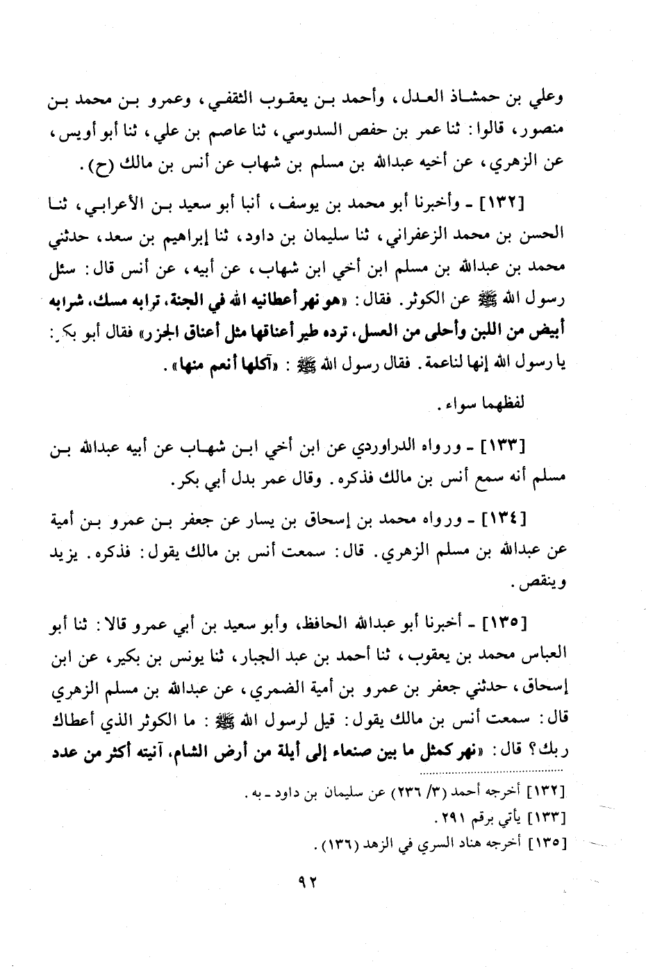 135 - (123) أَخْبَرَنَا أَبُو عَبْدِ اللَّهِ الْحَافِظُ , وَأَبُو سَعِيدِ بْنُ أَبِي عَمْرٍو قَالَا: ثنا أَبُو الْعَبَّاسِ مُحَمَّدُ بْنُ يَعْقُوبَ , ثنا أَحْمَدُ بْنُ عَبْدِ الْجَبَّارِ , ثنا يُونُسُ بْنُ بُكَيْرٍ , عَنِ ابْنِ إِسْحَاقَ , حَدَّثَنِي جَعْفَرُ بْنُ عَمْرِو بْنِ أُمَيَّةَ الضَّمْرِيُّ , عَنْ عَبْدِ اللَّهِ بْنِ مُسْلِمٍ الزُّهْرِيِّ , قَالَ: سَمِعْتُ أَنَسَ بْنَ مَالِكٍ , يَقُولُ: قِيلَ لِرَسُولِ اللَّهِ صَلَّى اللهُ عَلَيْهِ وَسَلَّمَ: مَا الْكَوْثَرُ الَّذِي أَعْطَاكَ رَبُّكَ؟ قَالَ: «نَهْرٌ كَمَثَلِ مَا بَيْنَ صَنْعَاءَ إِلَى أَيْلَةَ مِنْ أَرْضِ الشَّامِ , آنِيَتُهُ أَكْثَرُ مِنْ عَدَدِ #93# نُجُومِ السَّمَاءِ تَرِدُهُ طيور لَهَا أَعْنَاقٌ كَأَعْنَاقِ الْبُخْتِ» , فَقَالَ عُمَرُ بْنُ الْخَطَّابِ: وَاللَّهِ يَا رَسُولَ اللَّهِ إِنَّهَا لَنَاعِمَةٌ. فَقَالَ رَسُولُ اللَّهِ صَلَّى اللهُ عَلَيْهِ وَسَلَّمَ: «أَكْلُهَا أَنْعَمُ مِنْهَا»
