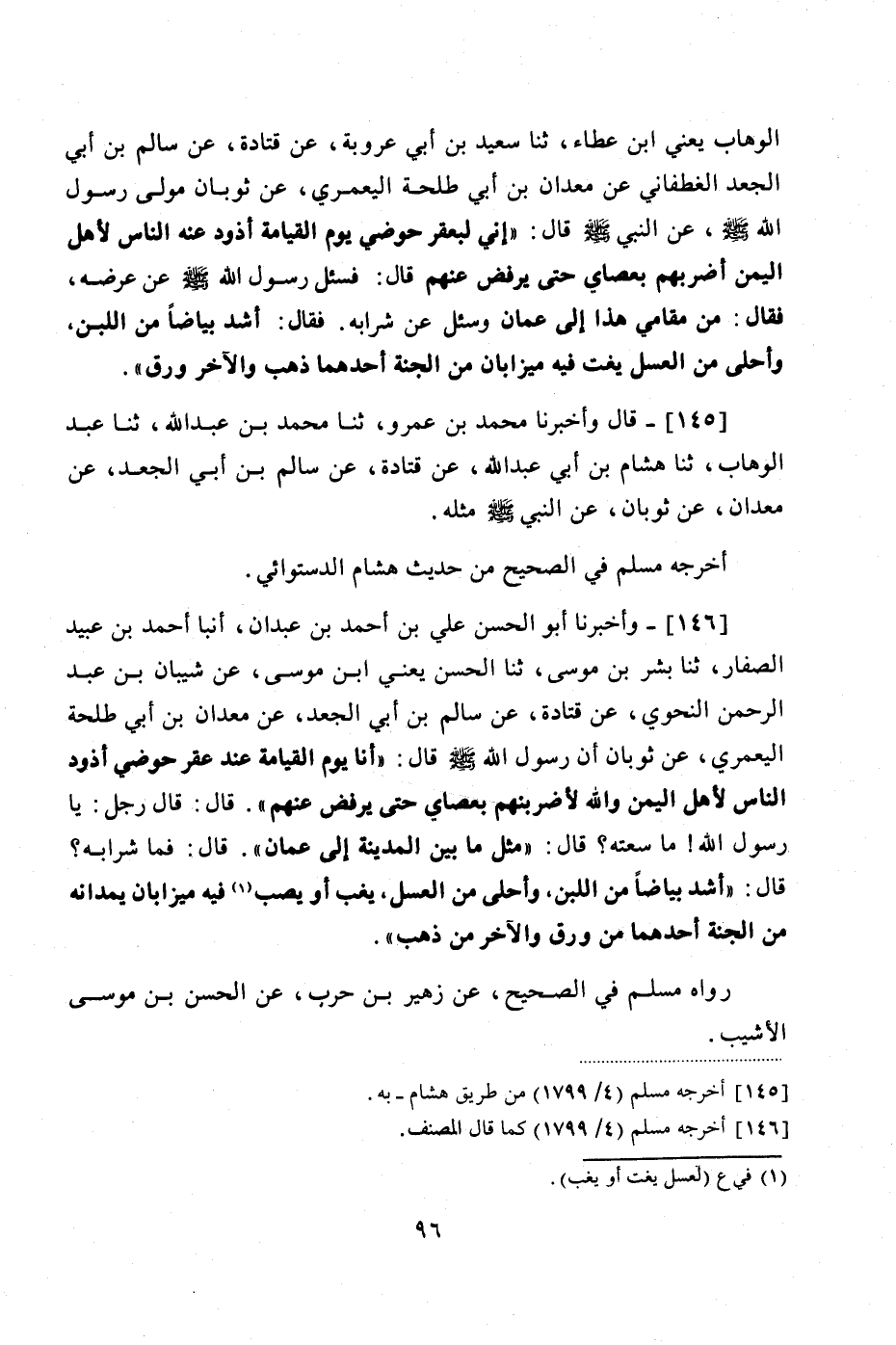 146 - (133) وَأَخْبَرَنَا أَبُو الْحَسَنِ عَلِيُّ بْنُ أَحْمَدَ بْنِ عَبْدَانَ , أَنْبَأَ أَحْمَدُ بْنُ عُبَيْدٍ الصَّفَّارُ , ثنا بِشْرُ بْنُ مُوسَى , ثنا الْحَسَنُ يَعْنِي ابْنَ مُوسَى , عَنْ شَيْبَانَ بْنِ عَبْدِ الرَّحْمَنِ النَّحْوِيِّ , عَنْ قَتَادَةَ , عَنْ سَالِمِ بْنِ أَبِي الْجَعْدِ , عَنْ مَعْدَانَ بْنِ أَبِي طَلْحَةَ الْيَعْمُرِيِّ , عَنْ ثَوْبَانَ , أَنَّ رَسُولَ اللَّهِ صَلَّى اللهُ عَلَيْهِ وَسَلَّمَ قَالَ: «أَنَا يَوْمُ الْقِيَامَةِ عِنْدَ عُقْرِ حَوْضِي أَذُودُ النَّاسَ لِأَهْلِ الْيَمَنِ وَاللَّهِ لَأَضْرِبَنَّهُمْ بِعَصَايَ حَتَّى يُرْفَضَ عَنْهُمْ» قَالَ: قَالَ رَجُلٌ: يَا رَسُولَ اللَّهِ مَا سِعَتُهُ؟ قَالَ: مِثْلُ مَا بَيْنَ الْمَدِينَةِ إِلَى عَمَّانَ , قَالَ: فَمَا شَرَابُهُ؟ قَالَ: أَشَدُّ بَيَاضًا مِنَ اللَّبَنِ , وَأَحْلَى مِنَ الْعَسَلِ ,يَغِبُّ أو يصب فِيهِ مِيزَابَانِ يَمُدَّانِهِ مِنَ الْجَنَّةِ أحْدهُمَا مِنْ وَرِقٍ وَالْآخَرُ مِنْ ذَهَبٍ "