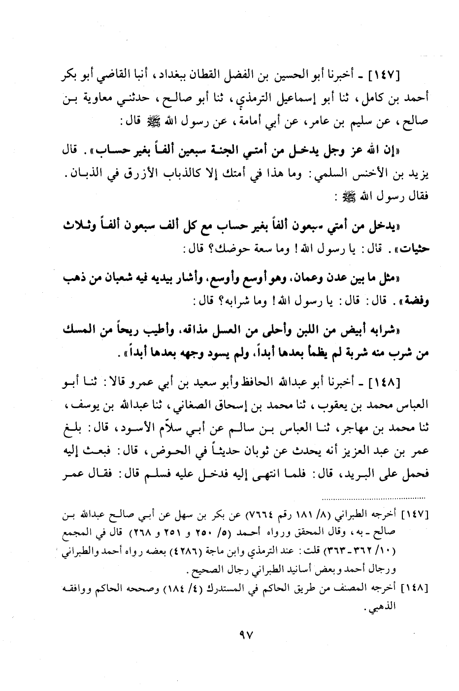 147 - (134) أَخْبَرَنَا أَبُو الْحُسَيْنِ بْنُ الْفَضْلِ الْقَطَّانُ , بِبَغْدَادَ , أَنْبَأَ الْقَاضِي أَبُو بَكْرٍ أَحْمَدُ بْنُ كَامِلٍ , ثنا أَبُو إِسْمَاعِيلَ التِّرْمِذِيُّ , ثنا أَبُو صَالِحٍ , حَدَّثَنِي مُعَاوِيَةُ بْنُ صَالِحٍ , عَنْ سُلَيْمِ بْنِ عَامِرٍ , عَنْ أَبِي أُمَامَةَ , عَنْ رَسُولِ اللَّهِ صَلَّى اللهُ عَلَيْهِ وَسَلَّمَ قَالَ: «إِنَّ اللَّهَ عَزَّ وَجَلَّ يُدْخِلُ مِنْ أُمَّتِي الْجَنَّةَ سَبْعِينَ أَلْفًا بِغَيْرِ حِسَابٍ» قَالَ يَزِيدُ بْنُ الْأَخْنَسِ السُّلَمِيُّ: وَمَا هَذَا فِي أُمَّتِكَ إِلَّا كَالذُّبَابِ الْأَزْرَقِ فِي الذِّبَّانِ , فَقَالَ رَسُولُ اللَّهِ صَلَّى اللهُ عَلَيْهِ وَسَلَّمَ: «يَدْخُلُ مِنْ أُمَّتِي سَبْعُونَ أَلْفًا بِغَيْرِ حِسَابٍ، مَعَ كُلِّ أَلْفٍ سَبْعُونَ أَلْفًا، وَثَلَاثُ حَثَيَاتٍ» , قَالَ: يَا رَسُولَ اللَّهِ وَمَا سِعَةُ حَوْضِكَ؟ قَالَ: «مِثْلُ مَا بَيْنَ عَدَنٍ , وَعَمَّانَ , وَهُوَ أَوْسَعُ , وَأَوْسَعُ , وَأَشَارَ بِيَدَيْهِ فِيهِ شُعْبَانُ مِنْ ذَهَبٍ وَفِضَّةٍ». قَالَ: قَالَ: يَا رَسُولَ اللَّهِ: وَمَا شَرَابُهُ؟ قَالَ: «شَرَابُهُ أَبْيَضُ مِنَ اللَّبَنِ، وَأَحْلَى مِنَ الْعَسَلِ مَذَاقَةً , وَأَطْيَبُ رِيحًا مِنَ الْمِسْكِ، مَنْ شَرِبَ مِنْهُ شَرْبَةً لَمْ يَظْمَا بَعْدَهَا أَبَدًا , وَلَمْ يَسْوَدَّ وَجْهُهُ بَعْدَهَا أَبَدًا»