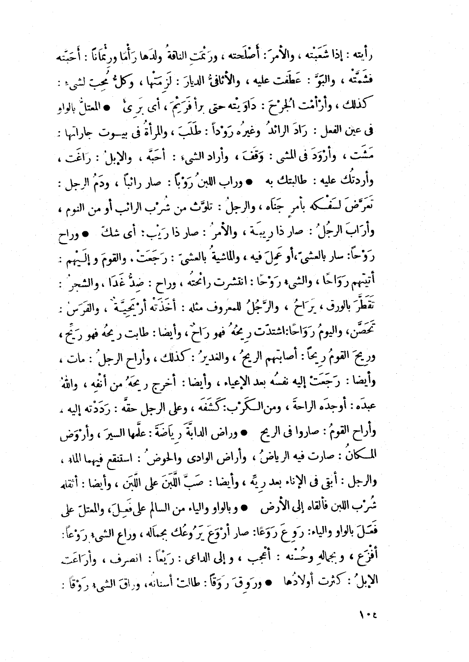 • المعتل بالواو في عين الفعل: راد الرائد وغيره رؤداً: طلب، والمرأة في بيوت جاراتها: مشت، وأرود في المشي: وقف، وأراد الشيء: أحبه، والإ [ل: راغت، وأردتك عليه: طالبتك به