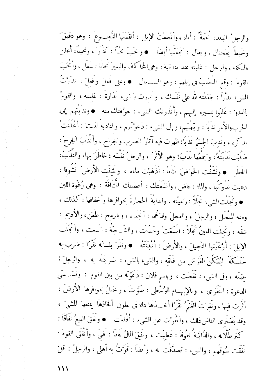 • ونجلت الشيء نجلاً: رميته، والدابة الحجارة بحوافرها وأخفافها: كذلك، ومنه المنجل، والرجل، وافحل ولدهما: أنجبه، وبالرمح: طعن، والأديم: شقه، ونجلت العين نجلاً: اتسعت وحسنت، والشجة: اتسعت، وأنجلت الإبل: أرعيتها النجيل، والأرض: أنبتته