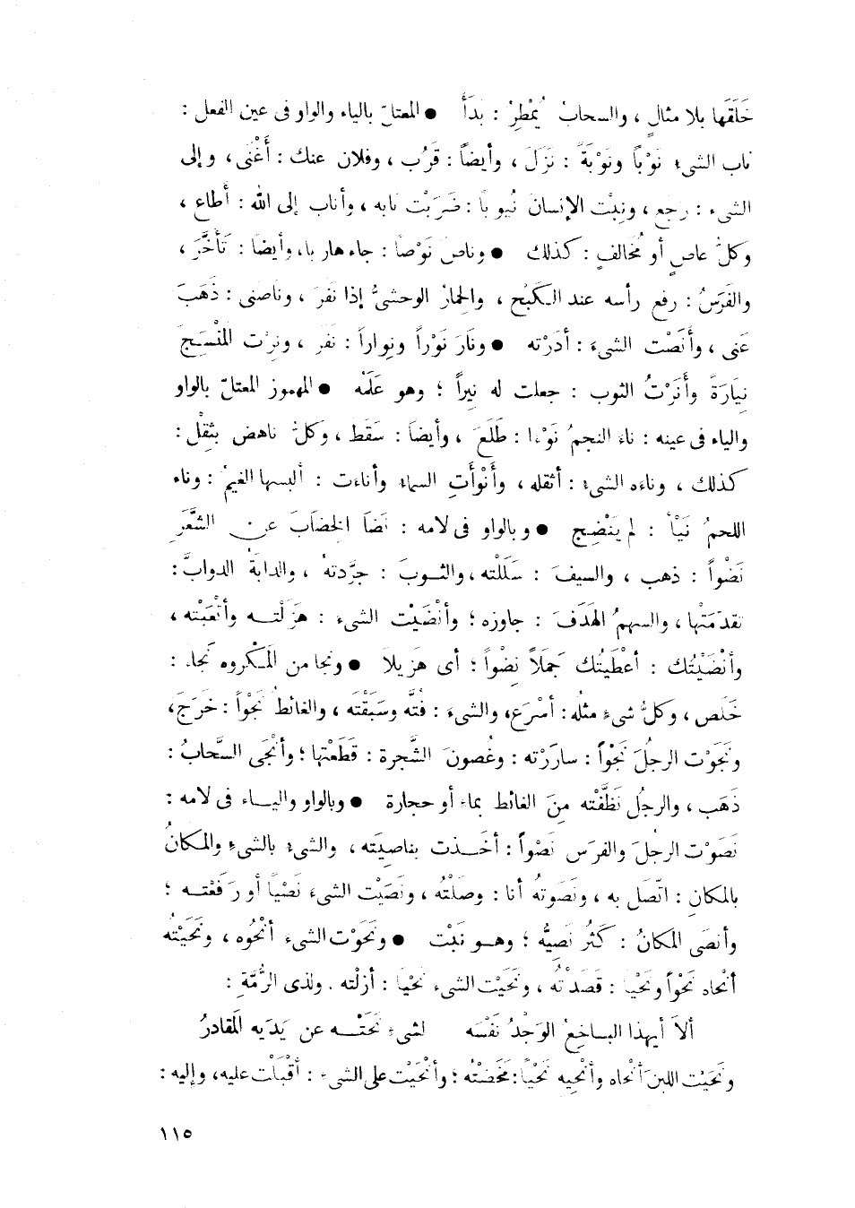 • المعتل بالياء والواو في عين الفعل: ناب الشيء نوباً ونوبة: نزل، وأيضاً: قرب، وفلان عنك: أغني، وإلى الشيء: رجع، ونبت الإنسان نيوباً: ضربت نابه، وأناب إلى الله: أطاع، وكل عاص أو مخالف: كذلك