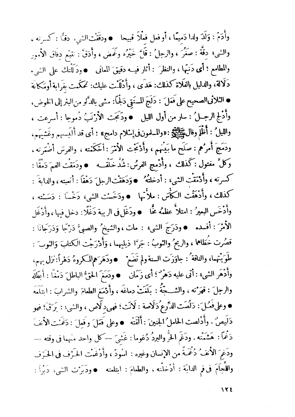 • الثلاثي الصحيح على فَعَلَ: دلج المتقي دلجاً: مشي بالدلو من البئر إلى الحوض، وأدلج الرجل: سار من أول الليل