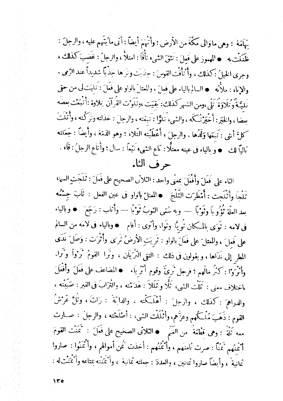 • وبالياء في لامه من السالم على فَعِلَ، والمعتل على فَعَلَ بالواو: ثريت الأرض ثرى وأثرت: وصل ندى المطر إلى نداها، ويقولون في ذلك: التقى الثريان، وثرا القوم ثرواً وثراً وأثروا: كثر مالهم؛ فرجل ثريٌ وقوم أثرياء