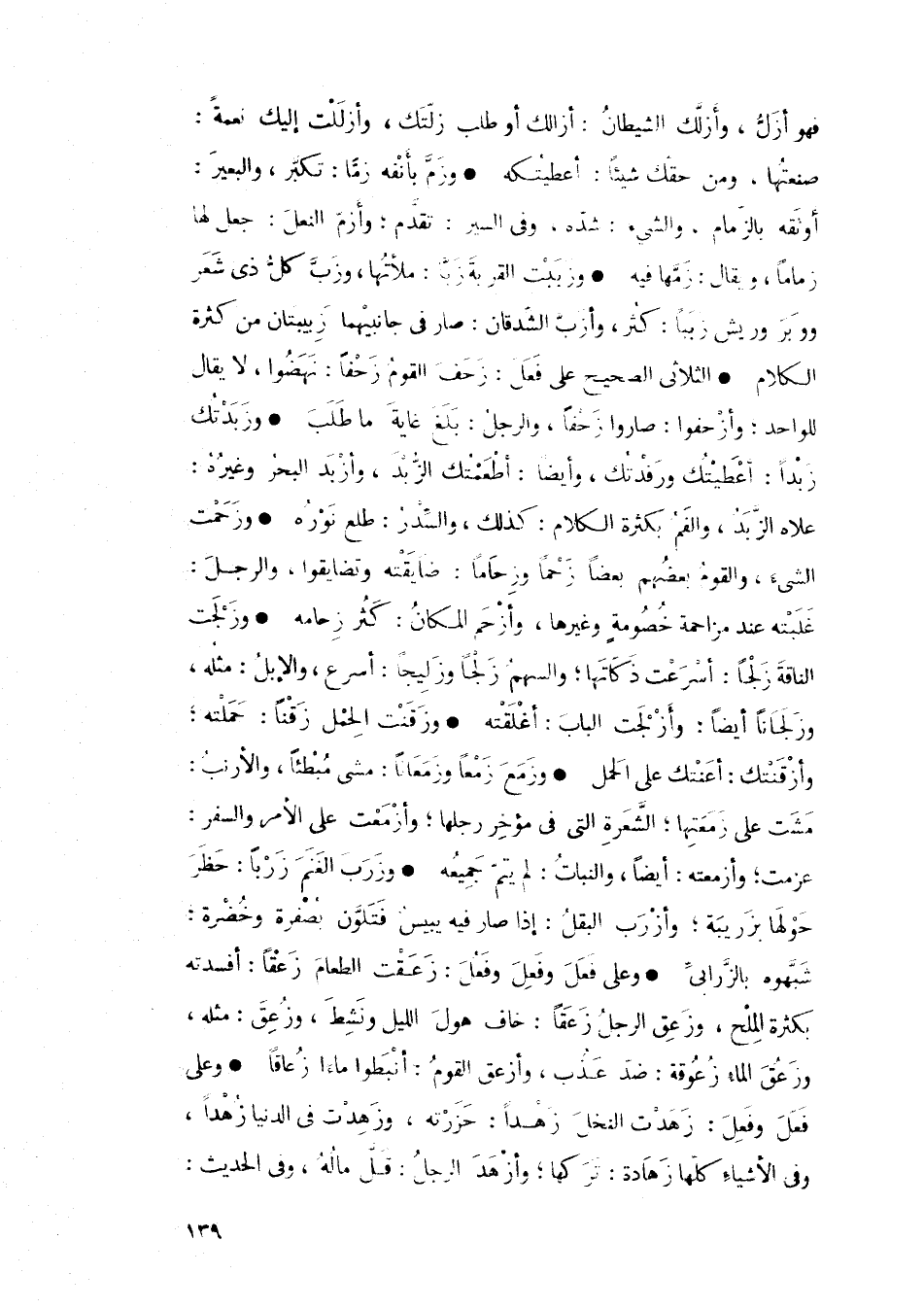 • وزببت القرية زباً: ملأتها، وزب كل ذي شعر ووبر وريش زيباً: كثر، وأزب الشدقان: صار في جانبيهما زيبتان من كثرة الكلام