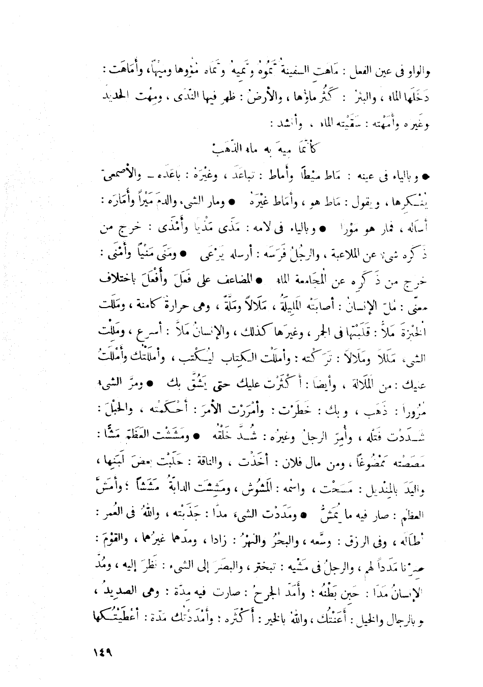 والواو في عين الفعل: ماهت السفية تموه وتميه وتماه مؤوها ومهيًا، وأماهت: دخلها الماء، والبئر: كثر ماؤها، والأرض: ظهر فيها الندى، ومهت الحديد وغيره وأمهته، سقيته الماء، وأنشد: