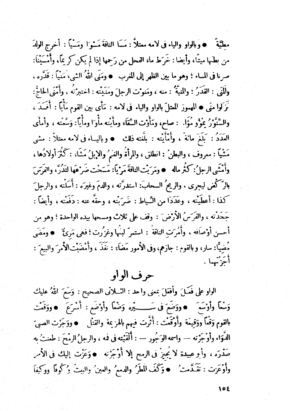 • المهموز المعتل بالواو والياء في لامه: مأى بين القوم مأياً: أفسد، والسنور يمؤو مواء: صاح، ومأوت السقاء ومأيته مأوا ومأياً: وسَّعته، وأمأى العددُ: بلغ مائة، وأمأيته: بلغته ذلك