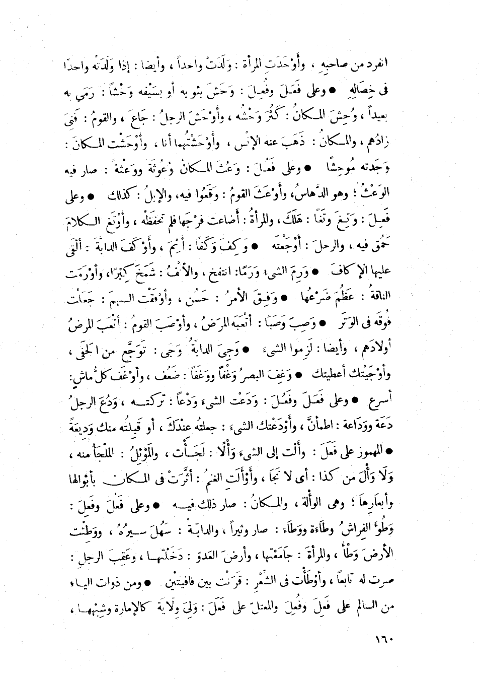 • وعلى فَعَلَ وفُعِلَ: وَحَشَ بثوبه أو بسيفه وَحشاً: رمي به بعيداً، وُحشَ المكانُ: كَثُرَ وحشُه، وأوحشَ الرجلُ: جاع، والقومُ: فَنيَ زادهم، والمكانُ: ذهب عنه الإنس، وأوحشتهما أنا، وأوحشت المكان: وجدته موحشاً