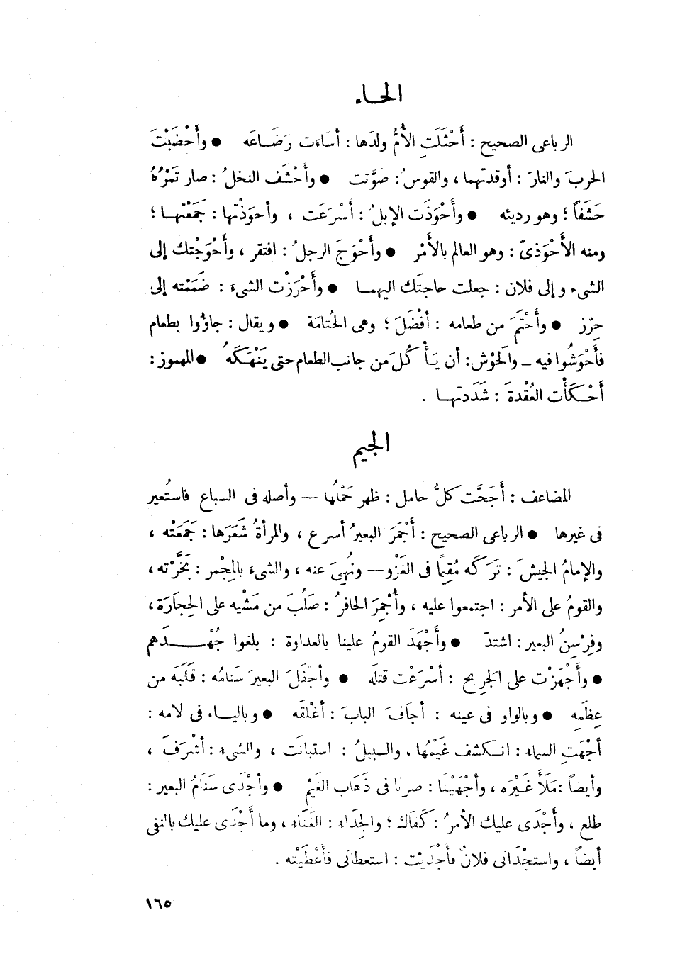 • الرباعي الصحيح: أجمَرَ البعيرُ أسرع، والمرأة شَعَرها: جمعته، والإمام الجيش: تركه مُقيماً في الغزو- ونُهيَ عنه، والشيء بالمجمر: بخَّرته، والقومُ على الأمر: اجتمعوا عليه، وأُجمِرَ الحافرُ: صَلُبَ من مشيه على الحِجارة، وفِرسِنُ البعير: اشتد