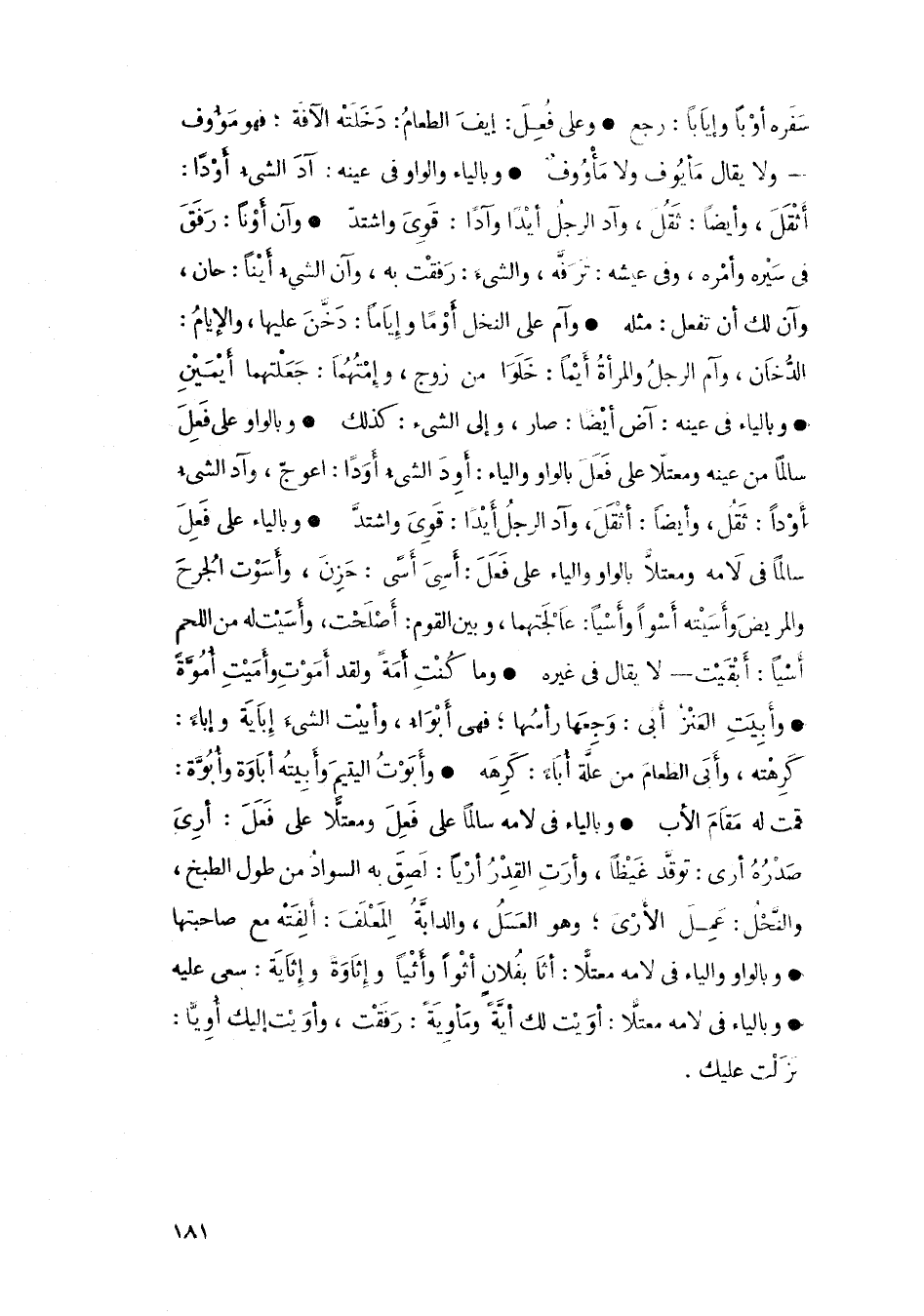 • وبالياء في لامه سالماً على فَعِلَ ومعتلاً على فَعَل: أرِيَ صَدرُهُ أرى: توقَّد غيظاً، وارَتِ القِدرُ أرياً: لَصِقَ به السوادُ من طول الطبخ، والنحلُ: عَمِلَ الأرى؛ وهو العسلُ، والدابةُ المِعْلَف: ألِفته مع صاحبتها
