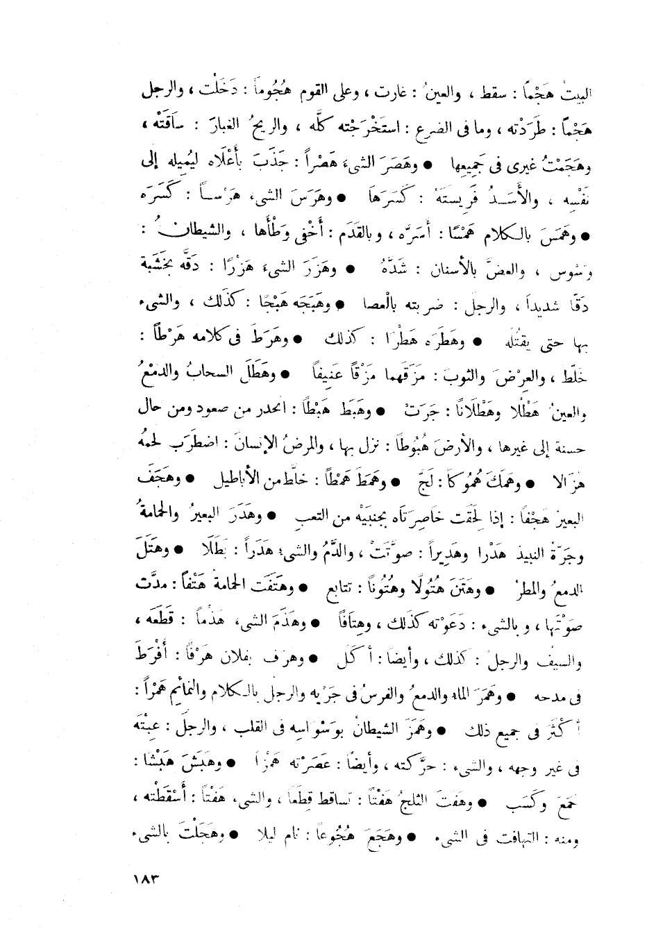 البيت هجماً: سقط، والعينُ: غارت، وعلى القوم هُجوماً: دخلت، والرجل هجماً: طردته، وما في الضرع: استخرجته كلَّه، والريحُ الغبار: ساقته، وهجمتُ غيري في جميعها