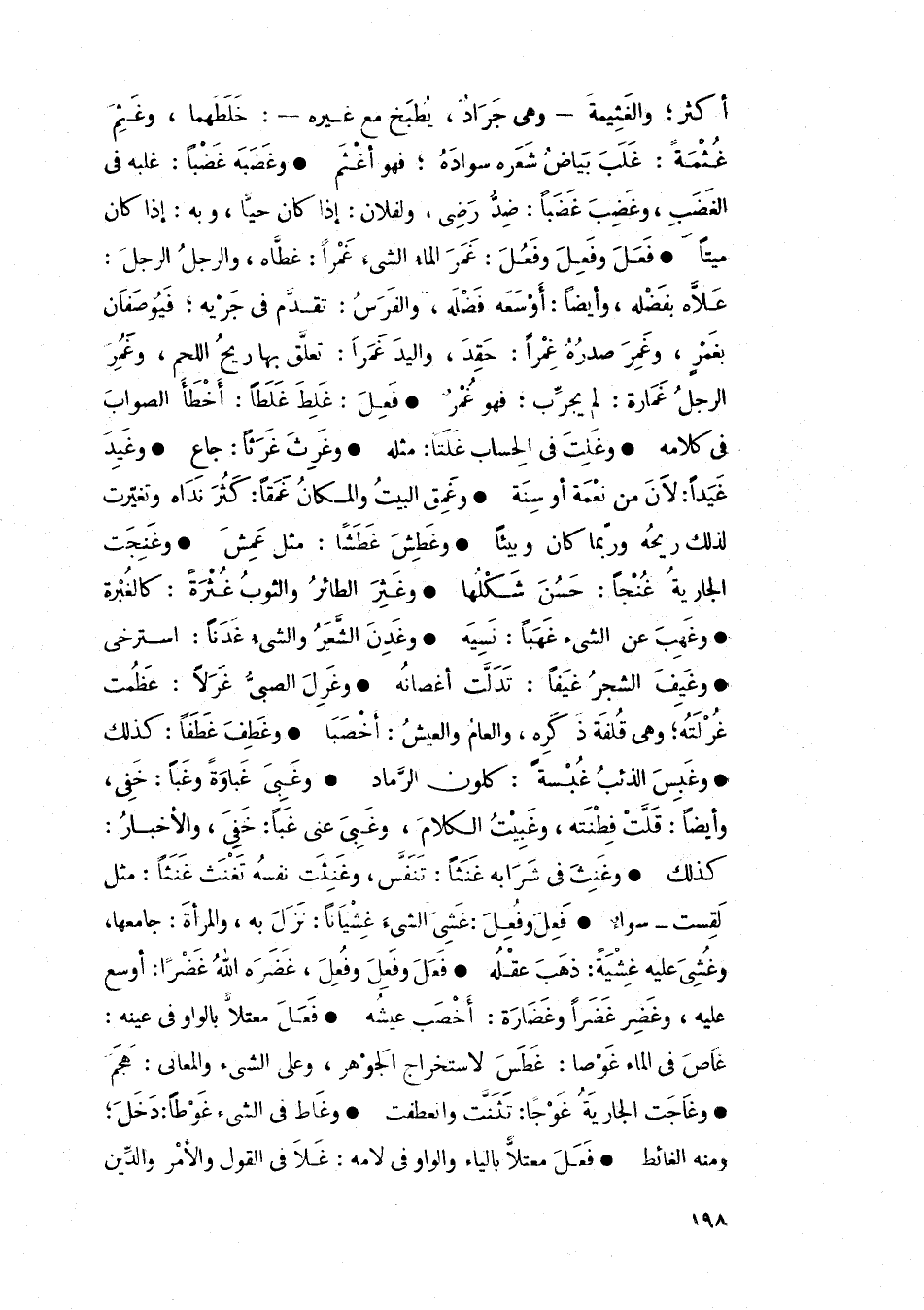 • فَعَلَ معتلاً بالواو في عينه: غاص في الماء غوصاً: غسَ لاستخراج الجوهر، وعلى الشيء والمعاني: هجم