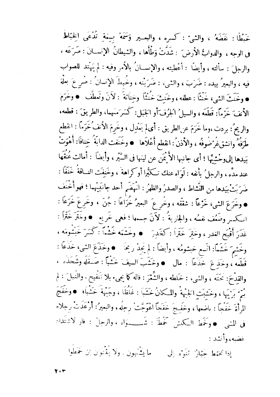 خبطاً: نفضه، والشيء: كسره، والبعير وسمة بسمة تدعى الخباط فى الوجه، والدواب الأرض: شدت وطأها، والشيطان الإنسان: صرعه، والرجل: سألته، وأيضاً: أعطيته، والإنسان بالأمر وفيه: لم يهتد للصواب فيه، والبعير بيده: ضرب، والشيء: ضربته، وخبط الإنسان: صرع بعله