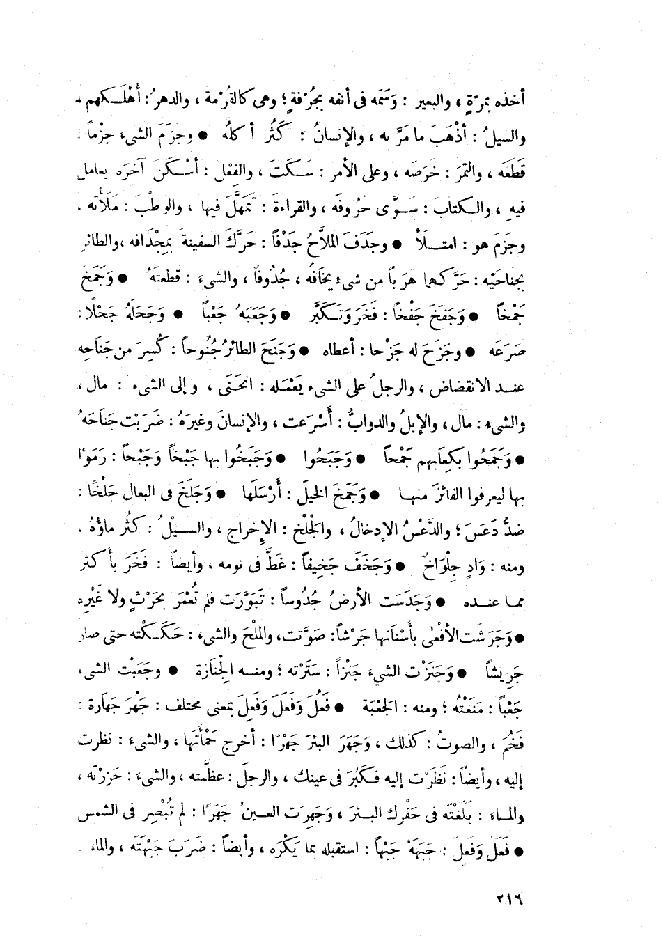 • وجزم الشيء جزماً: قطعه، والتمر: خرصه، وعلى الأمر: سكت، والفعل: أسكن آخره بعامل فيه، والكتاب: سوى حروفه، والقراءة: تمهل فيها، والوطب: ملاته، وجزم هو: امتلأ
