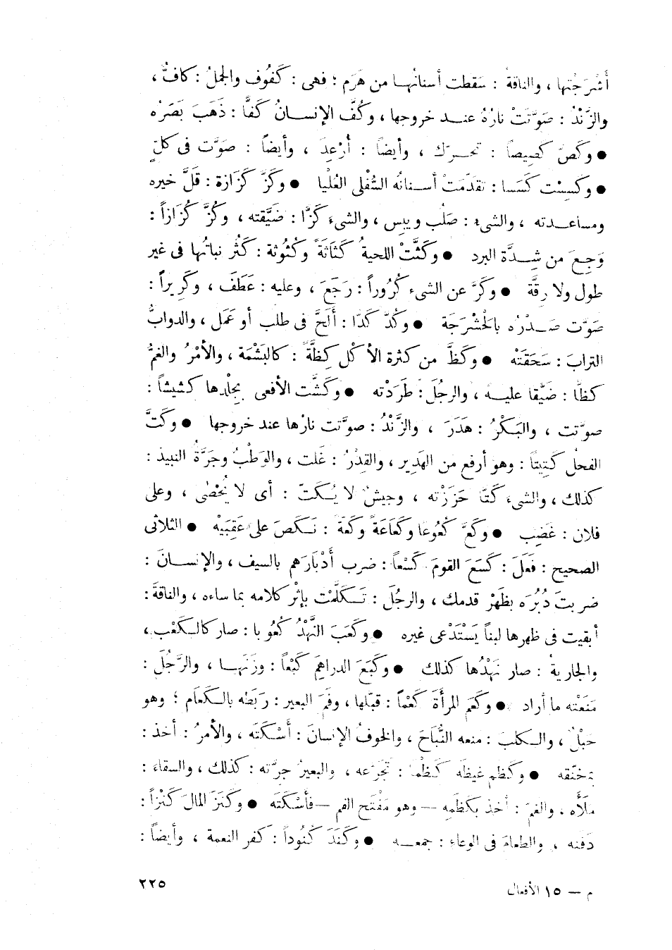 أشرجتها، والناقة: سقطت أسنانها من هرم؛ فهي: كفوف والجمل: كاف، والزند: صوتت ناره عند خروجها، وكف الإنسان كفاً: ذهب بصره