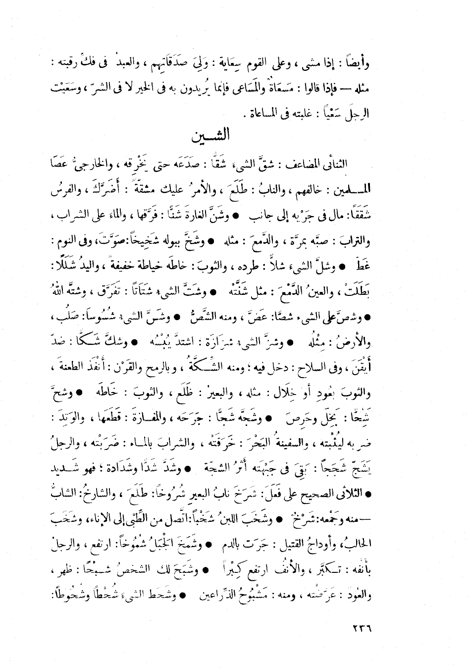 الثنائى المضاعف: شق الشيء شقاًّ: صدعه حتى يخرقه، والخارجى عصا المسلمين: خالفهم، والناب: طلع، والأمر عليك مشقةً: أضرك، والفرس شققاً: مال في جريه إلى جانب