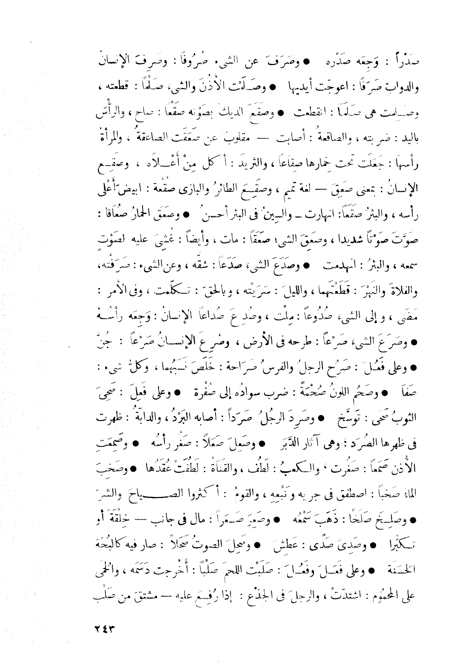 • وصدع الشيء صدعاً: شقه، وعن الشيء: صرفته، والفلاة والنهر: قطعتهما، والليل: سريته، وبالحق: تكلمت، وفي الأمر: مضى، وإلى الشيء صدوعاً: ملت، وصدع صداعاً الإنسان: وجعه رأسه