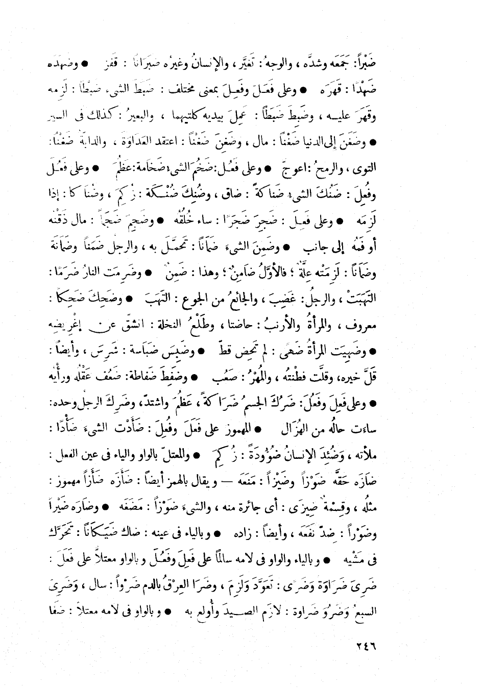 • وبالياء والواو في لامه سالماً على فَعِلَ وفَعُلَ وبالواو معتلاً على فَعَلَ: ضَرِىَ ضراوة وَضَرَى: تعود ولزم، وضرا العرق بالدم ضرواً: سال، وَضَرِىَ السبع وضرو ضراوة: لازم الصيد وأولع به