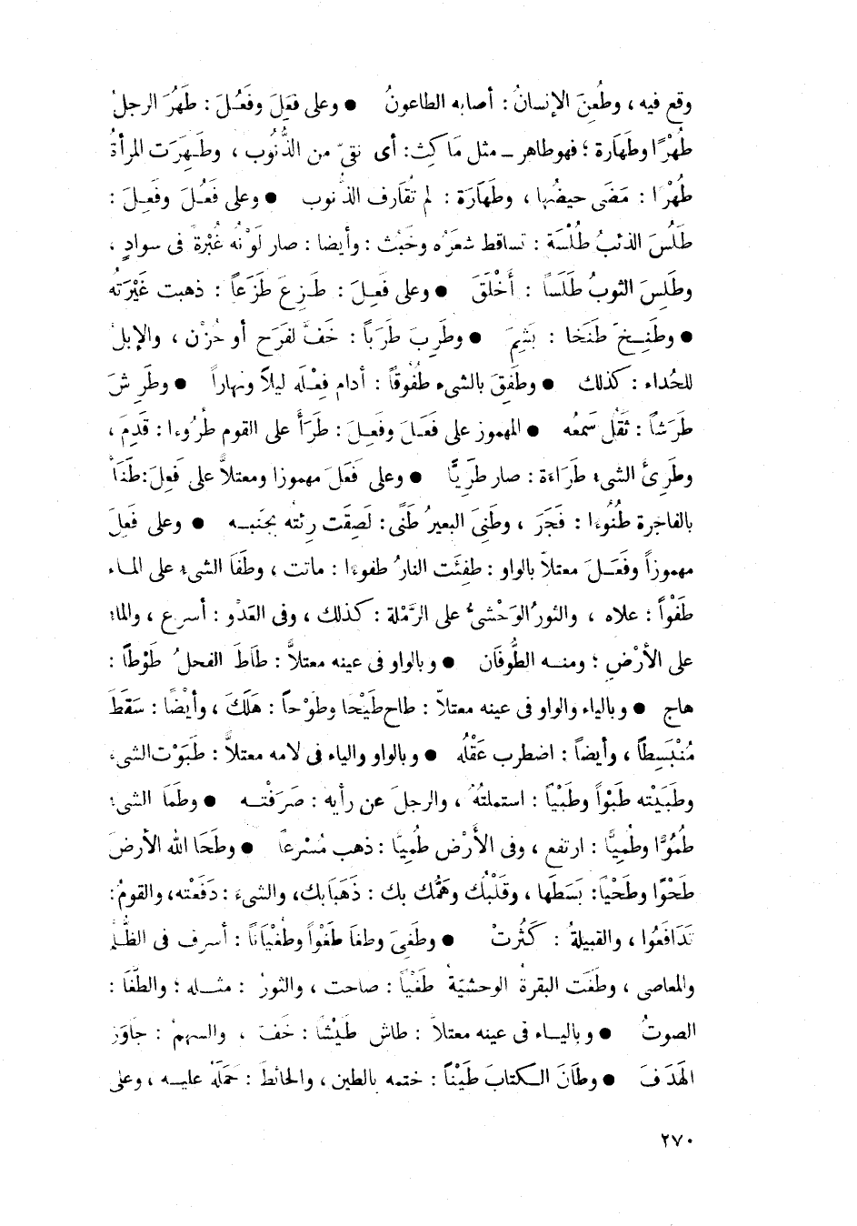 • وعلى فَعِلَ مهموزًا وفَعَلَ معتلًا بالواو: طفئت النار طفوءا: ماتت، وطفا الشيء على الماء طفوًا: علاه، والثور الوحشي على الرملة: كذلك، وفي العدو: أسرع، والماء على الأرض؛ ومنه الطوفان
