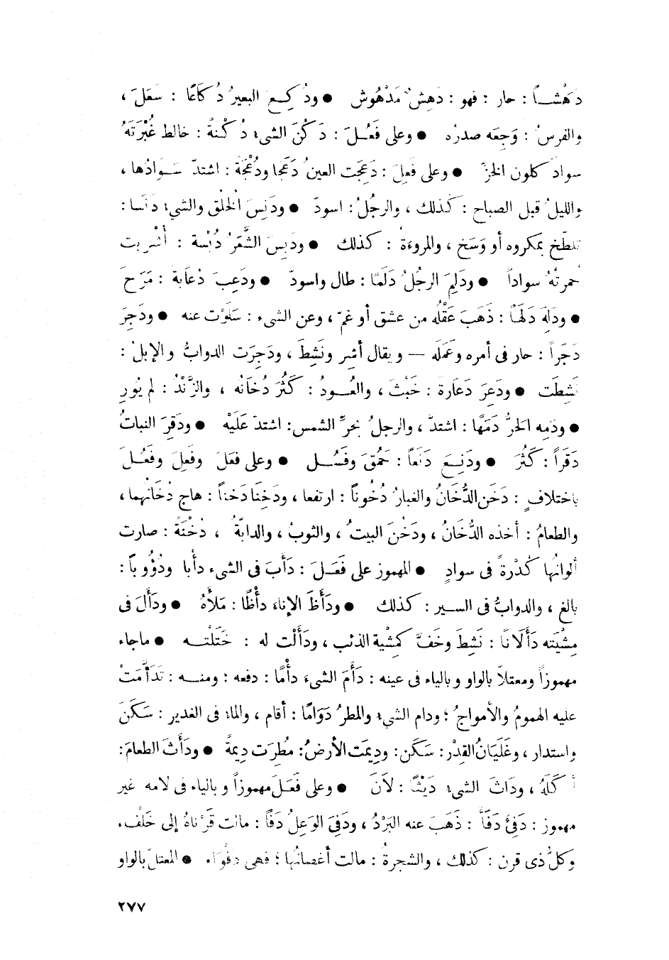 • ما جاء مهموزًا ومعتلًّا بالواو وبالياء فى عينه: دأم الشئ دأمًا: دفعه؛ ومنه: تدأمت عليه الهموم والأمواج؛ ودام الشيء والمطر دوامًا: أقام، والماء فى الغدير: سكن واستدار، وغليان القدر: سكن: وديمت الأرض: مطرت ديمةً