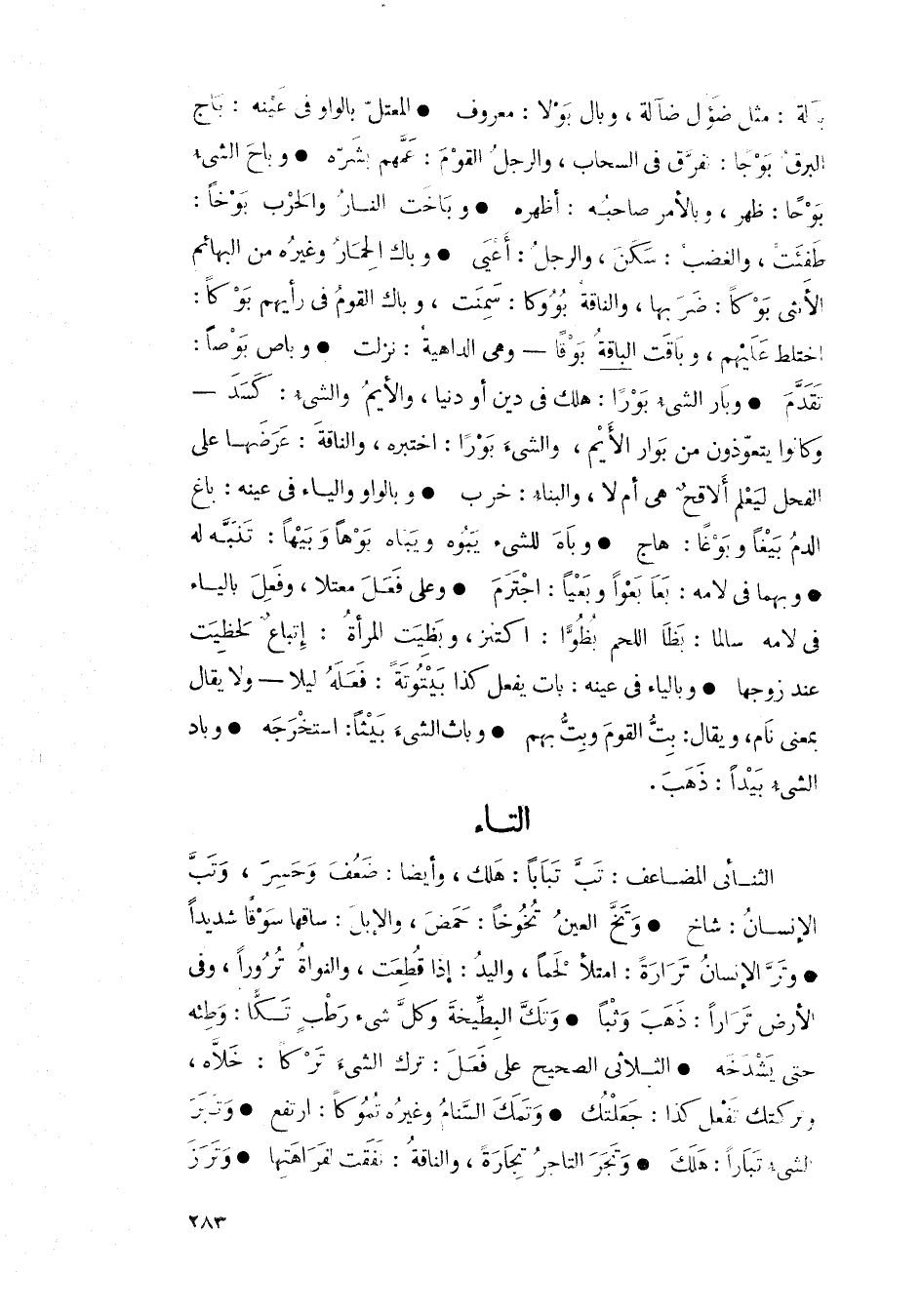 • وبار الشئ بورًا: هلك فى دين أو دنيا، والأيم والشئ: كسد - وكانوا يتعوذون من بوار الأيم، والشئ بورًا: اختبره، والناقة: عرضها على الفحل ليعلم ألاقحٌ هى أم لا، والبناء: خرب