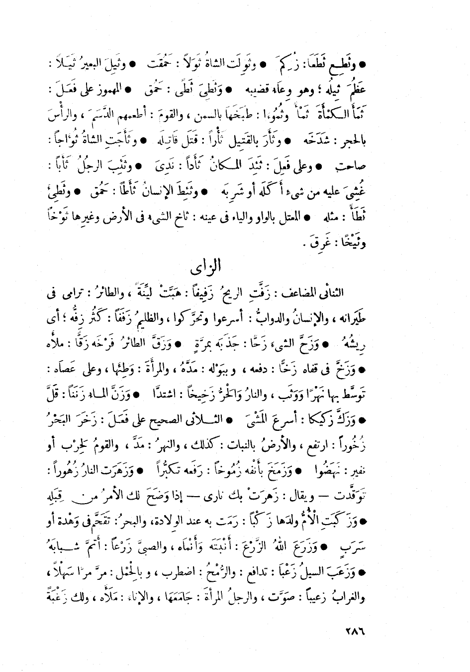 • وزعب السيلُ زعباً: تدافع: والرمح: اضطرب، وبالحِمل: مرَّ مراً سهلاً، والغرابُ زعيباً: صوَّت، والرجلُ المرأة: جامعها، والإناء: ملأه، ولك زغبةً