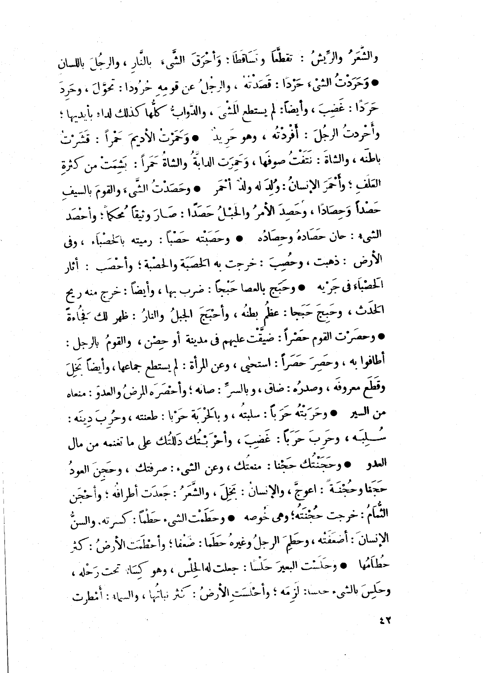 • وحردت الشيء حرداً: قصدته، والرجل عن قومه حرودا: تحول، وحرد حرداً: غضب، وأيضاً: لم يستطع المشى، والدواب كلها كذلك لداء بأيديها؛ وأحردت الرجل: أفردته، وهو حريد