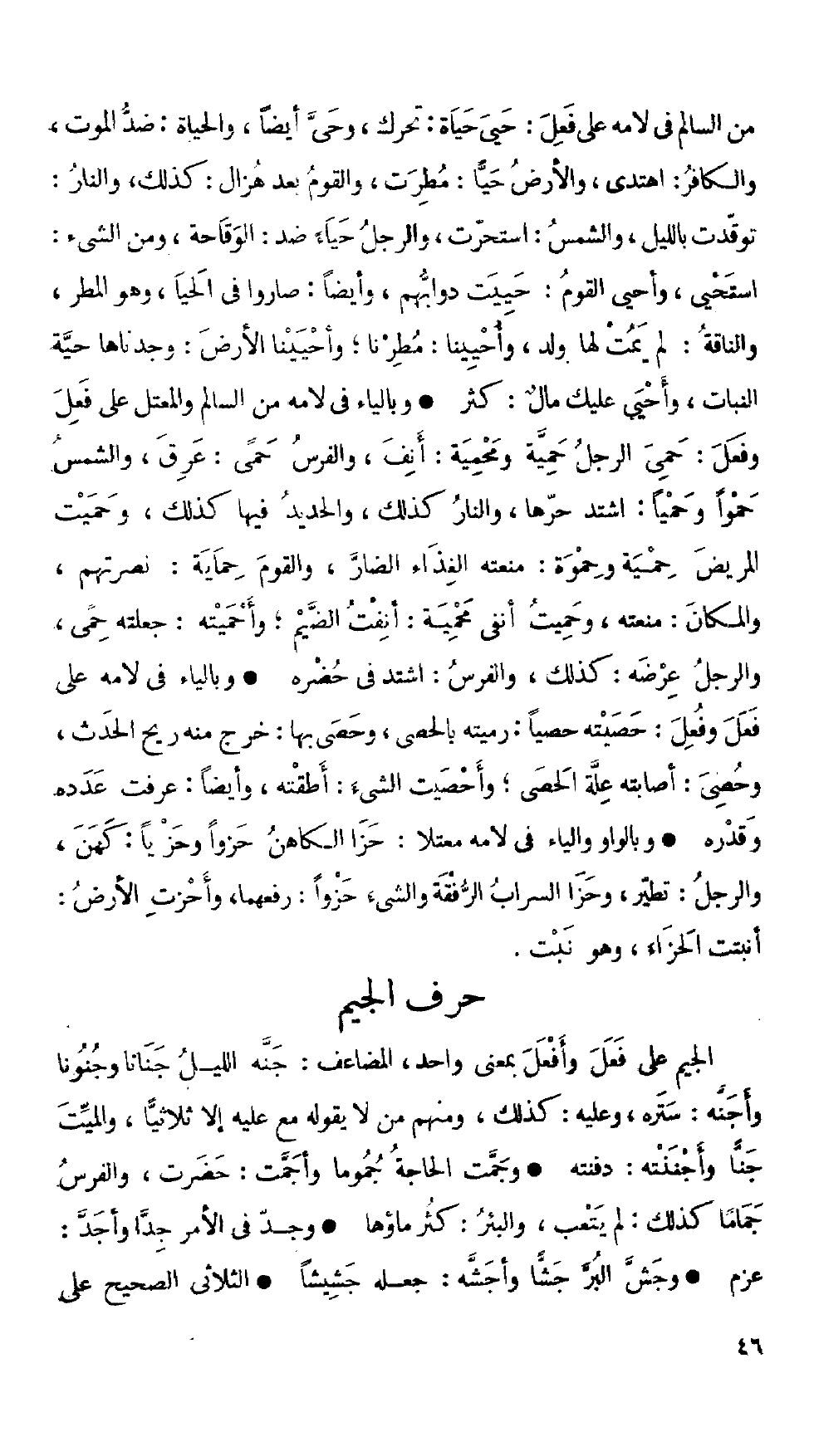من السالم في لامه على فَعِلَ: حيى حياة: تحرك، وحى أيضاً، والحياة: ضد الموت، والكافر: اهتدى، والأرض حياً: مطرت، والقوم بعد هزال: كذلك، والنار: توقدت بالليل، والشمس: استحرت، والرجل حياء ضد: الوقاحة، ومن الشيء: استحيي، وأحيي القوم: حييت دوابهم، وأيضا: صاروا في الحيا، وهو المطر، والناقة: لم يمت لها ولد، وأحيينا: مطرنا؛ وأحيينا الأرض: وجدناها حية النبات، وأحيي عليك مال: كثر